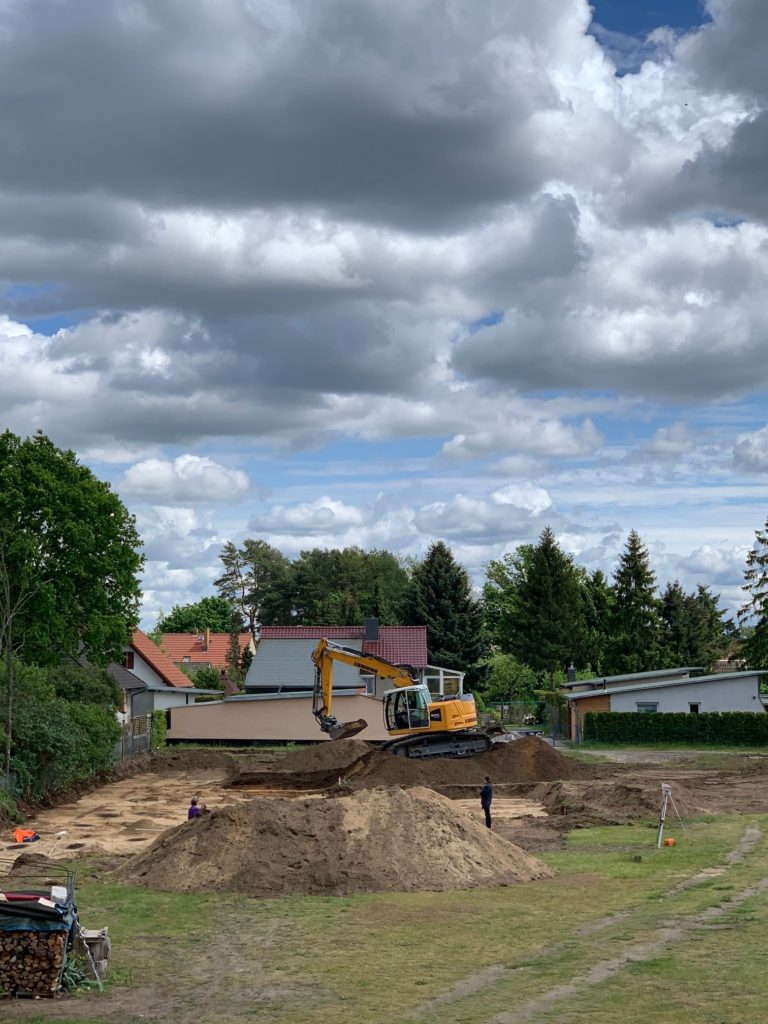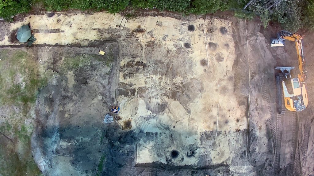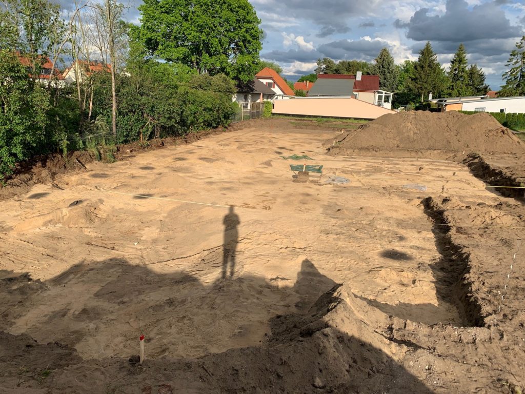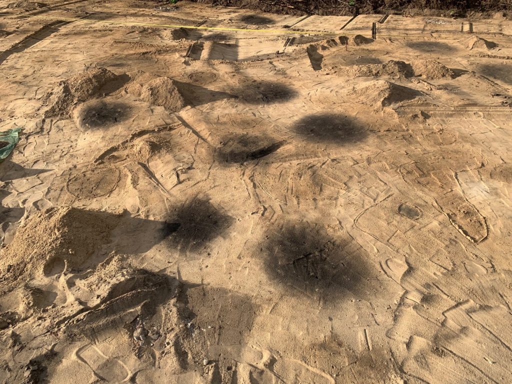 Tag 2 bringt weitere umfangreiche Fundstellen an Feuerstellen. Der Archäologe hat solche umfangreichen Befunde an einer Stelle selbst noch nicht gesehen. Dadurch verzögern sich die Baumaßnahmen um 2 Tage, da die Dokumentation abgeschlossen sein muss, bevor die Kiesschicht eingebaut werden darf. Zum Glück ist jetzt die gesamte Fläche geöffnet und es dürften keine weiteren Überraschungen zu erwarten sein.