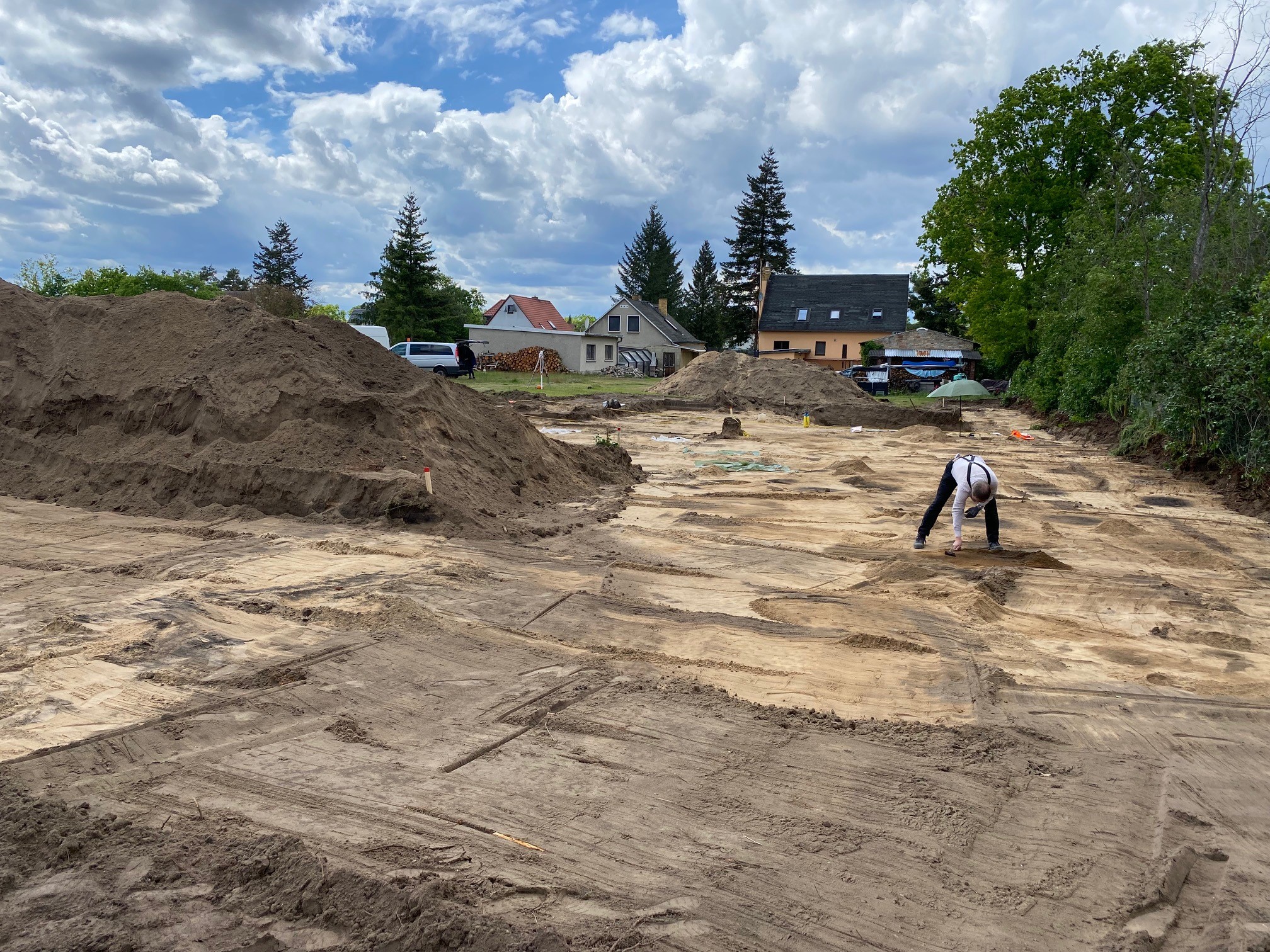 Tag 2 bringt weitere umfangreiche Fundstellen an Feuerstellen. Der Archäologe hat solche umfangreichen Befunde an einer Stelle selbst noch nicht gesehen. Dadurch verzögern sich die Baumaßnahmen um 2 Tage, da die Dokumentation abgeschlossen sein muss, bevor die Kiesschicht eingebaut werden darf. Zum Glück ist jetzt die gesamte Fläche geöffnet und es dürften keine weiteren Überraschungen zu erwarten sein.