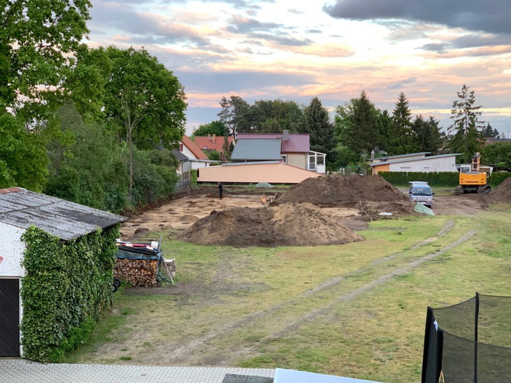 An Tag 3 war der Archäologe den ganzen Tag allein im Baufeld und hat dokumentiert. Zwischenzeitlich kamen die Tiefbauer der Brawag und haben den Abwasseranschluss abgestimmt. Auch dafür darf dann der Archäologe wieder dabei sein. Als um 20:41 Uhr das Sonnenuntergangsfoto entstand, war er immer noch am dokumentieren. Hoffentlich wird das am Freitag abgeschlossen, so dass am Montag der Kies eingebaut werden kann.