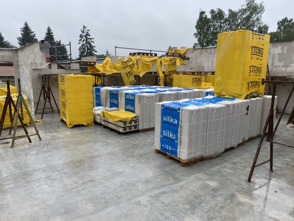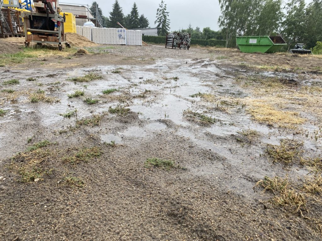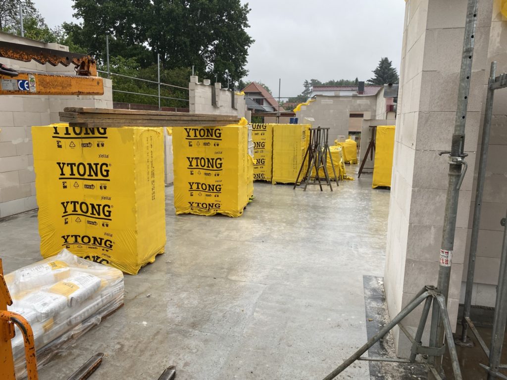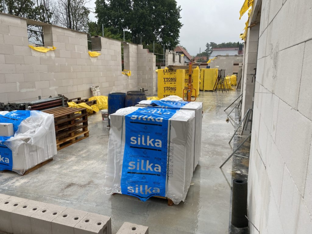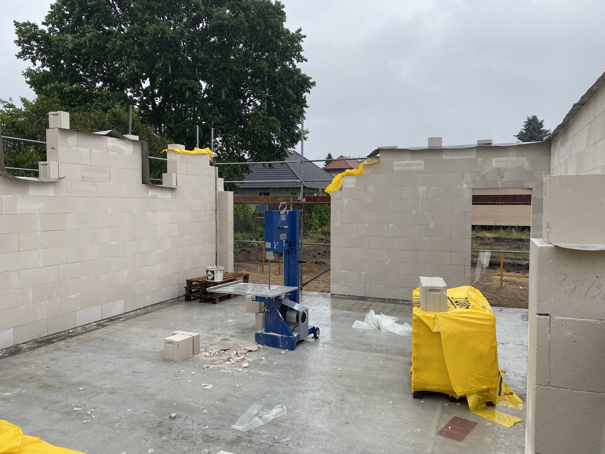 Tag 37 – Viel Regen 30. Juni 2021 von ah Heute wurde weiter gemauert, aber starker Regen und eine Unwetterwarnung sorgten für einen früheren aber nassen Feierabend auf der Baustelle. Die Außenwände sind fast fertig und die erste Lage der Innenwand zum Arbeitszimmer ist auch gesetzt.