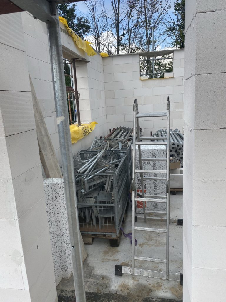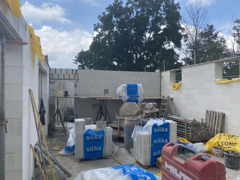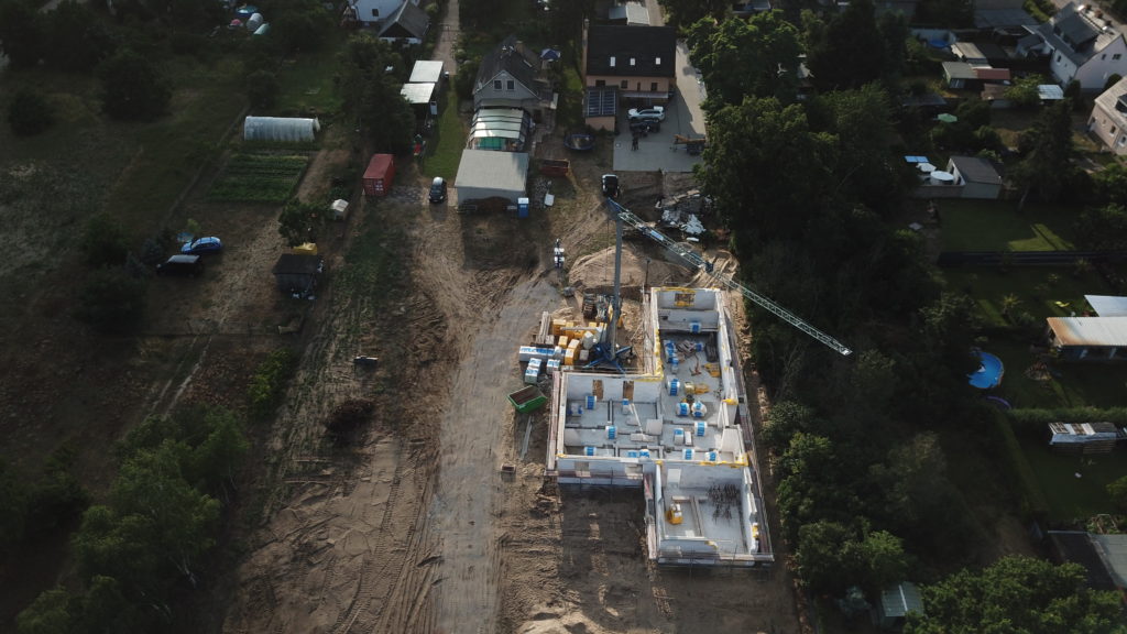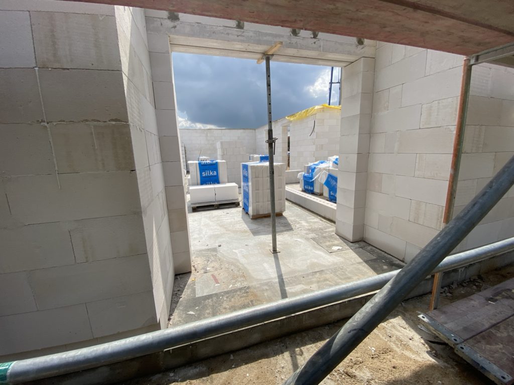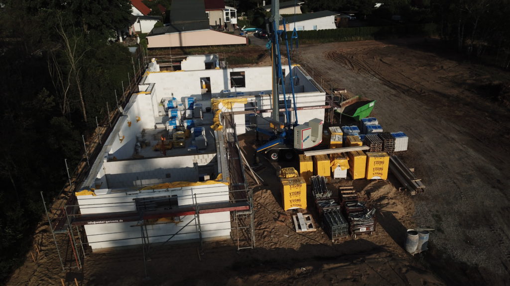 Heute sind die Außenwände fertiggestellt worden und die erste Innenwand. Alle anderen Innenwände sind begonnen worden. Das Arbeitszimmer ist schon „fertig“. In der Garage fehlt noch der Sturz, der wird aber mit Stahlträger betoniert. Auf den Luftbildern kann man den Grundriss der Räume schon gut erkennen.