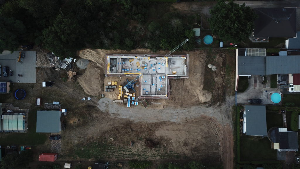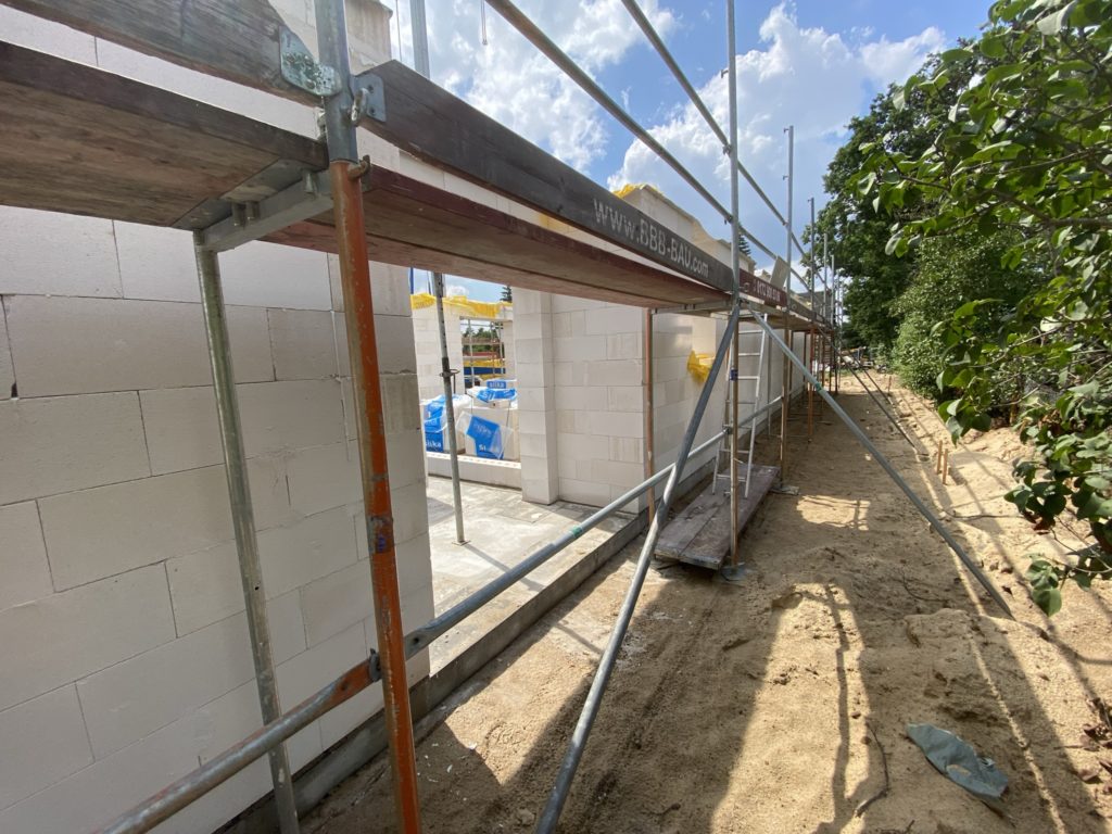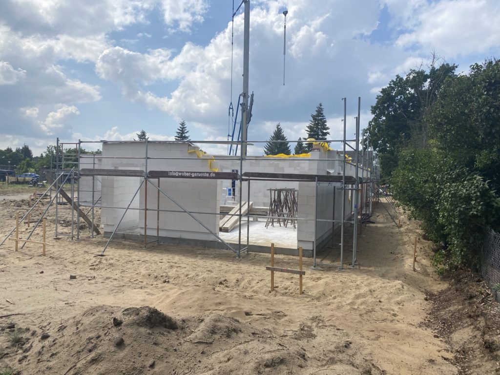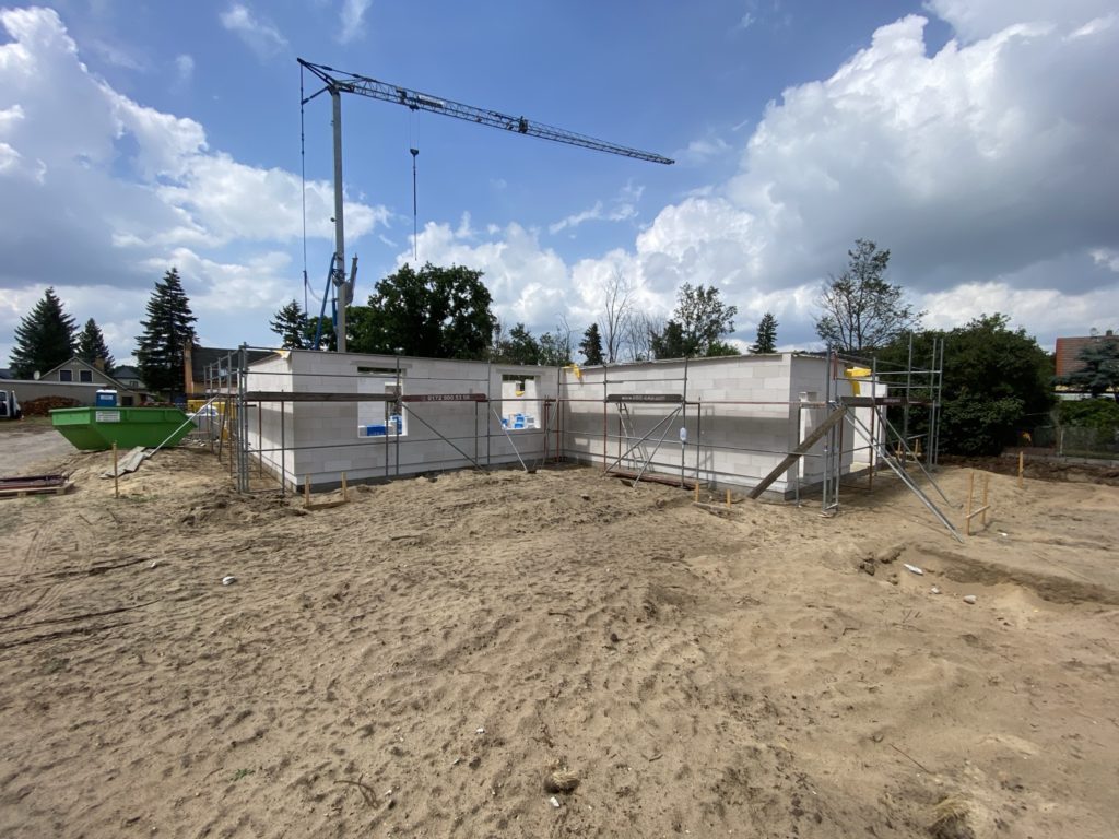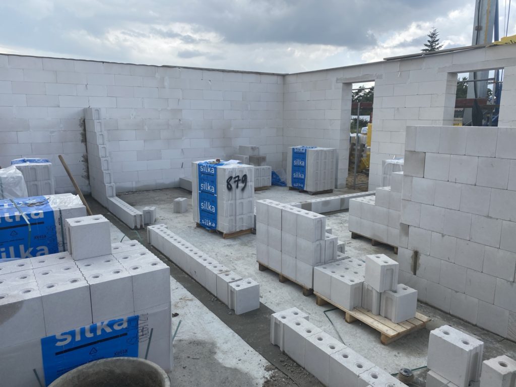 Heute sind die Außenwände fertiggestellt worden und die erste Innenwand. Alle anderen Innenwände sind begonnen worden. Das Arbeitszimmer ist schon „fertig“. In der Garage fehlt noch der Sturz, der wird aber mit Stahlträger betoniert. Auf den Luftbildern kann man den Grundriss der Räume schon gut erkennen.