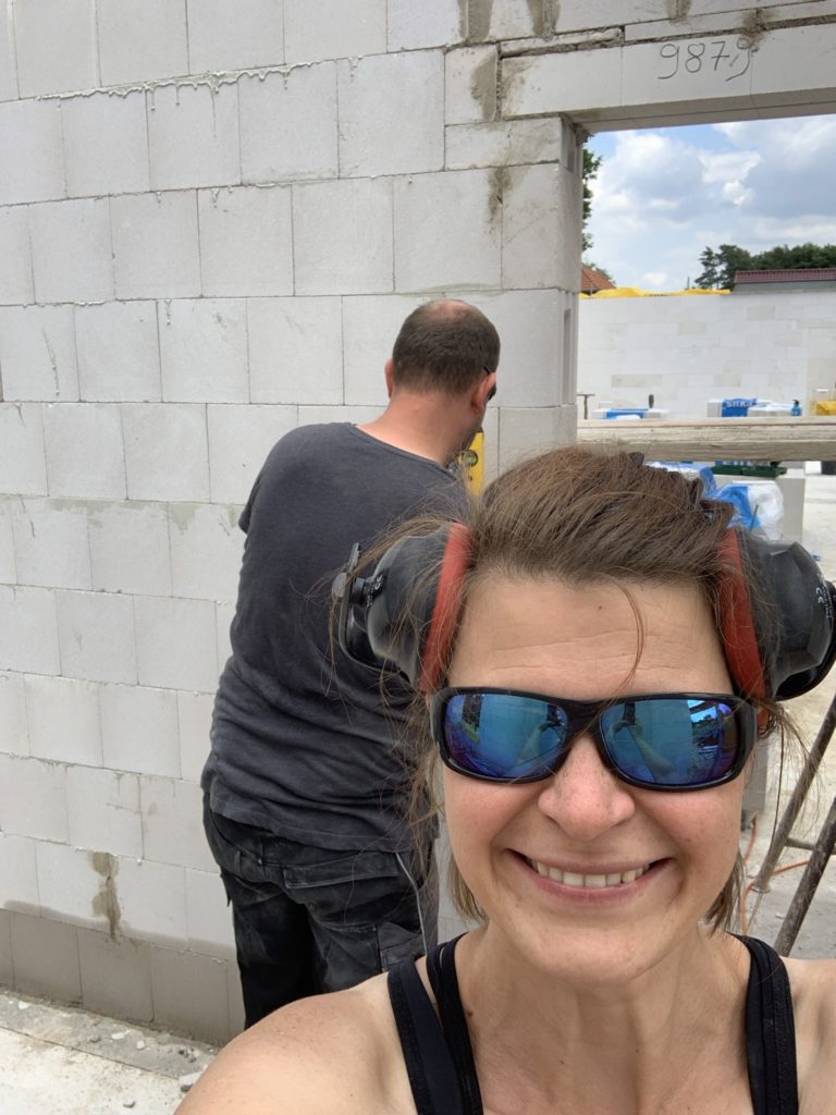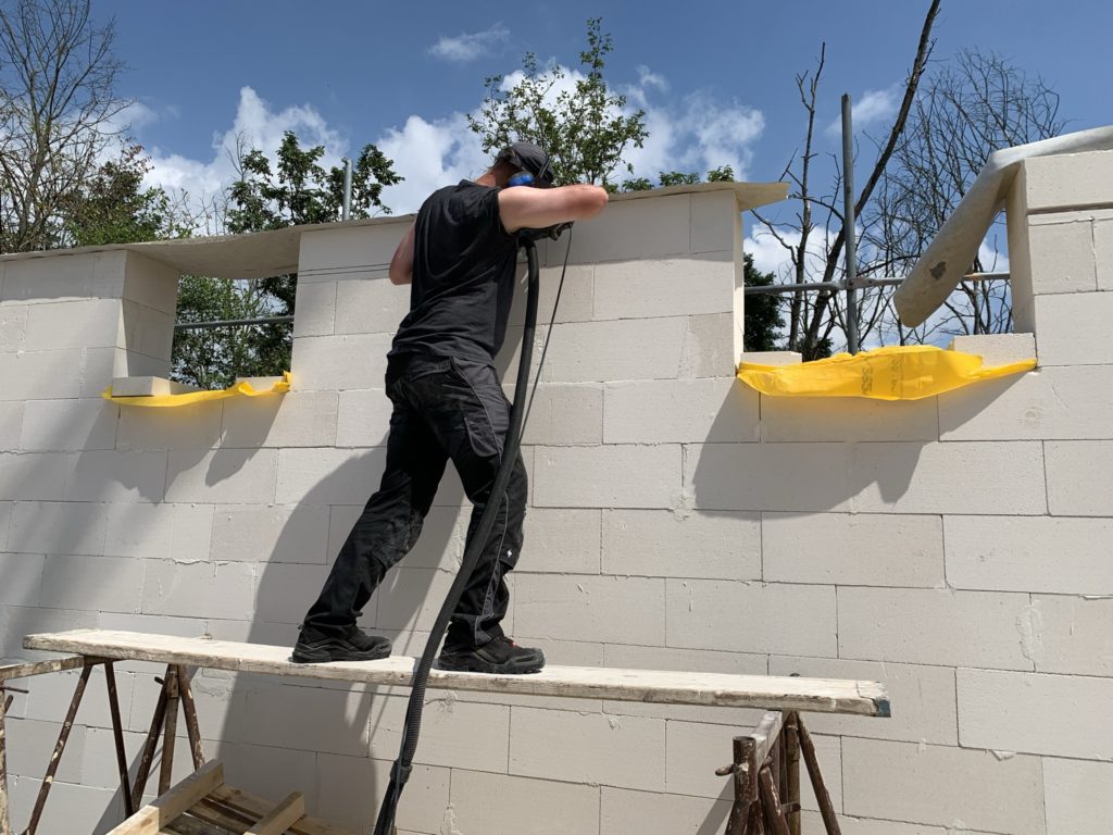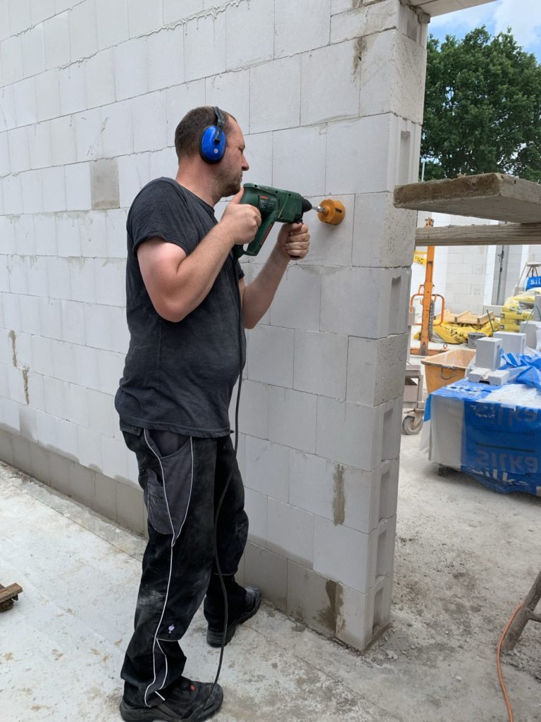 Heute haben wir die oberen Wandschlitze für die KNX-Anbindung der Rollläden erstellt. Wenn dann das Dach drauf ist, macht es noch weniger Spaß da oben knapp unter der Decke zu schlitzen. Außerdem ist im Arbeitszimmer die erste Dose gesenkt worden – ich brauche eine größere Maschine 🙂