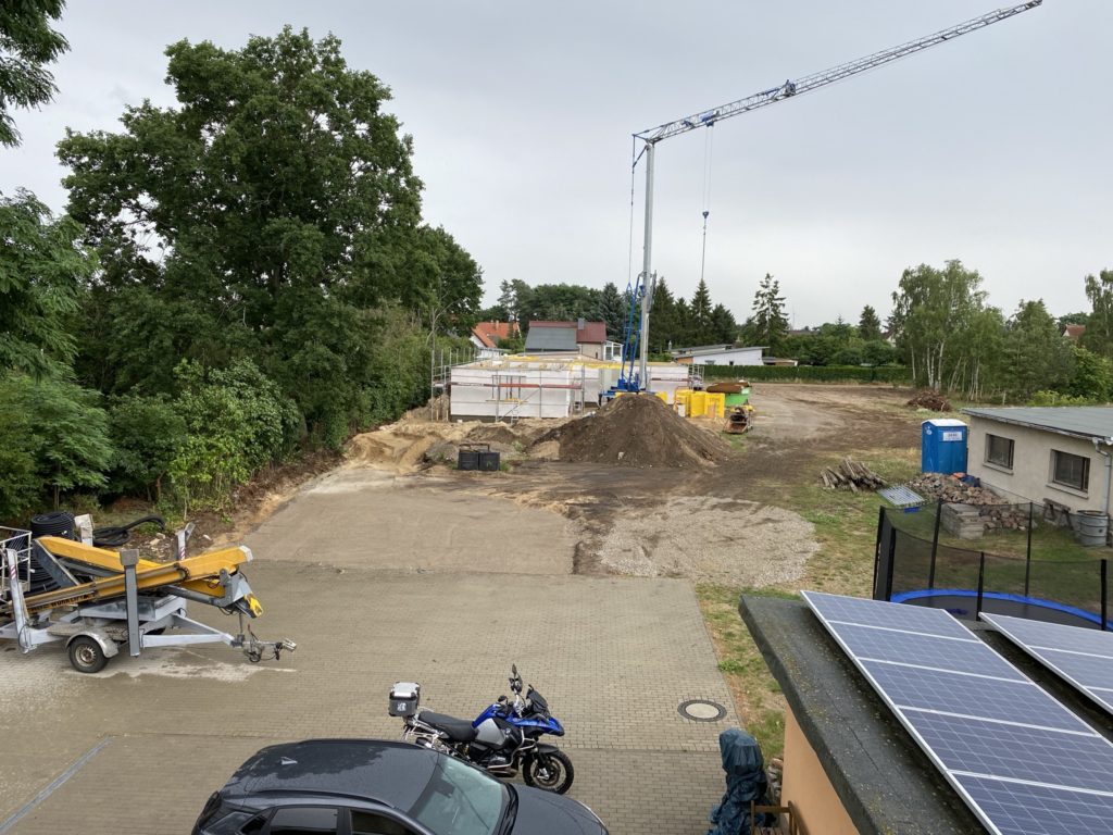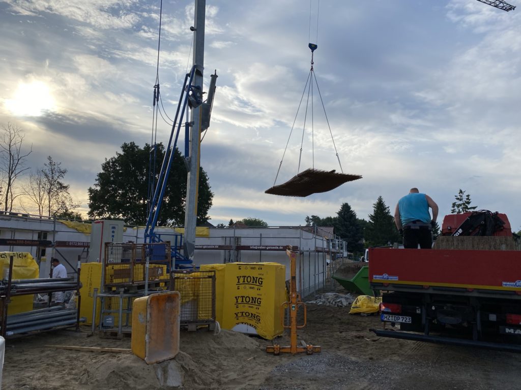 Heute wurde in die freigelegte Fläche für die Feuerwehrbewegungsfläche Recycling eingebaut und verdichtet. Die restlichen Jochs wurden gestellt und der Übergang von Bodenplatte zum Mauerwerk mit mineralischer Dichtschlämme abgedichtet. Die Stahlmatten für die obere Bewehrung des Dachs wurden ebenfalls geliefert.
