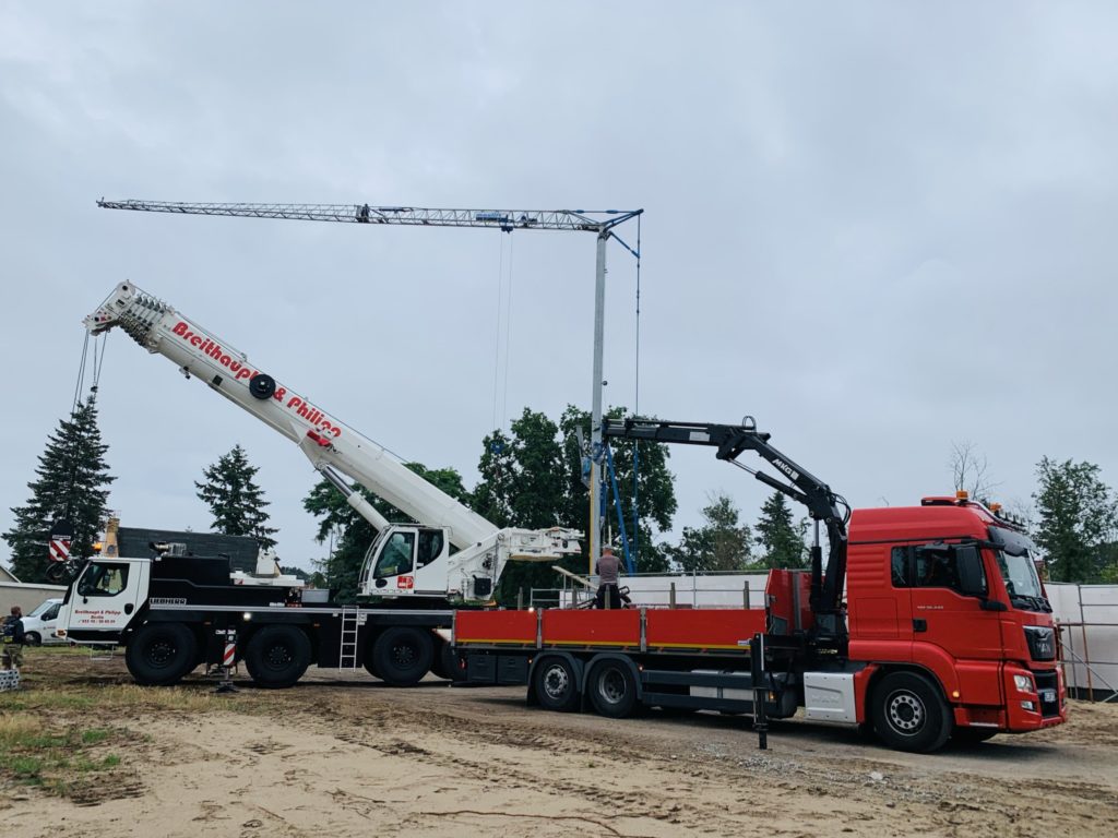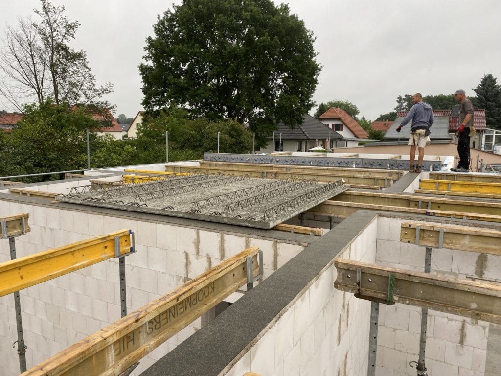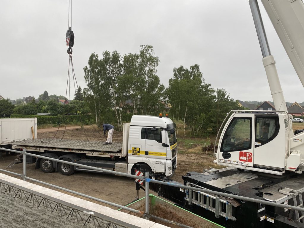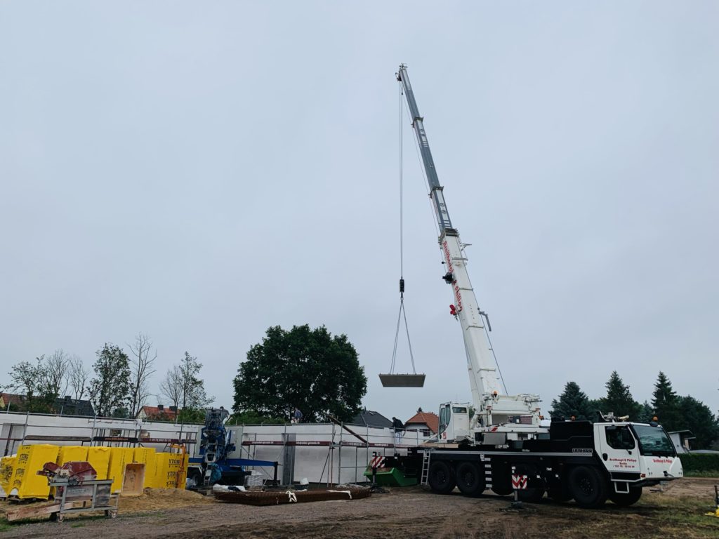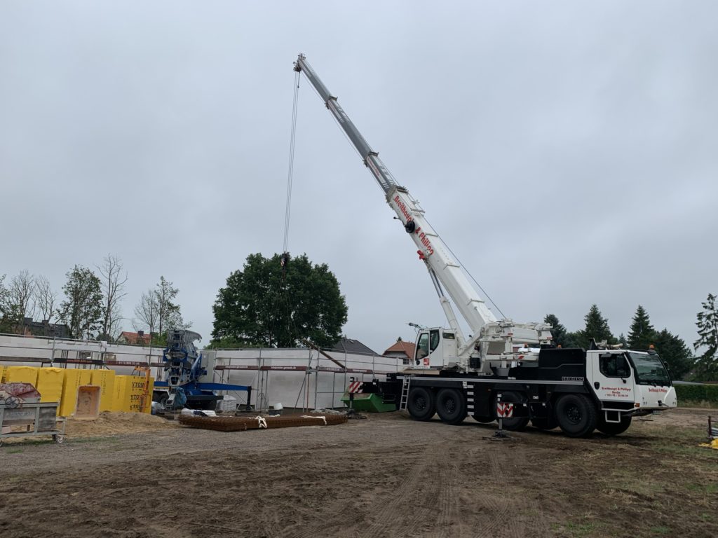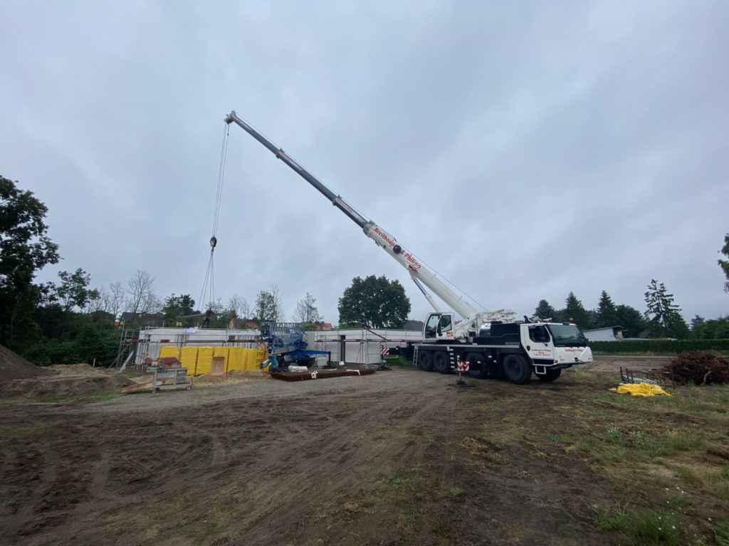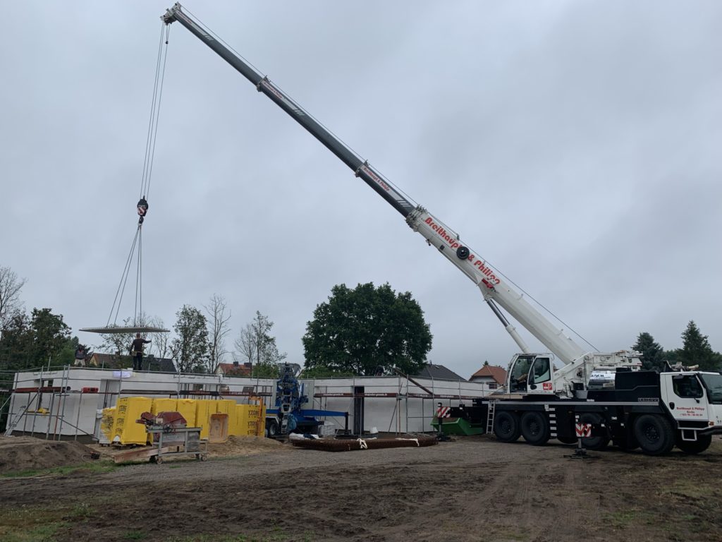 Heute wurden die Betonelemente fürs Dach gelegt. In nicht einmal 3 Stunden wurden alle 26 Elemente verlegt. Kurzeitig waren 3 Krane gleichzeitig im Einsatz. Der „kleine Arm“ am LKW der den Stahl abgeladen hat, der normale Baukran hat Platz geschaffen und der große 60-Tonnen-Autokran hat verlegt. Zwischenzeitlich musste der Baukran einwenig Platz machen. Beim hintersten Element für die Garage war selbst der große Autokran schon bei 90% seiner Möglichkeiten angelangt. Das Element wiegt ca. 3,5 Tonnen und war recht weit weg. Das leichteste Element ist über dem Eingangsbereich mit gerademal 397 kg.