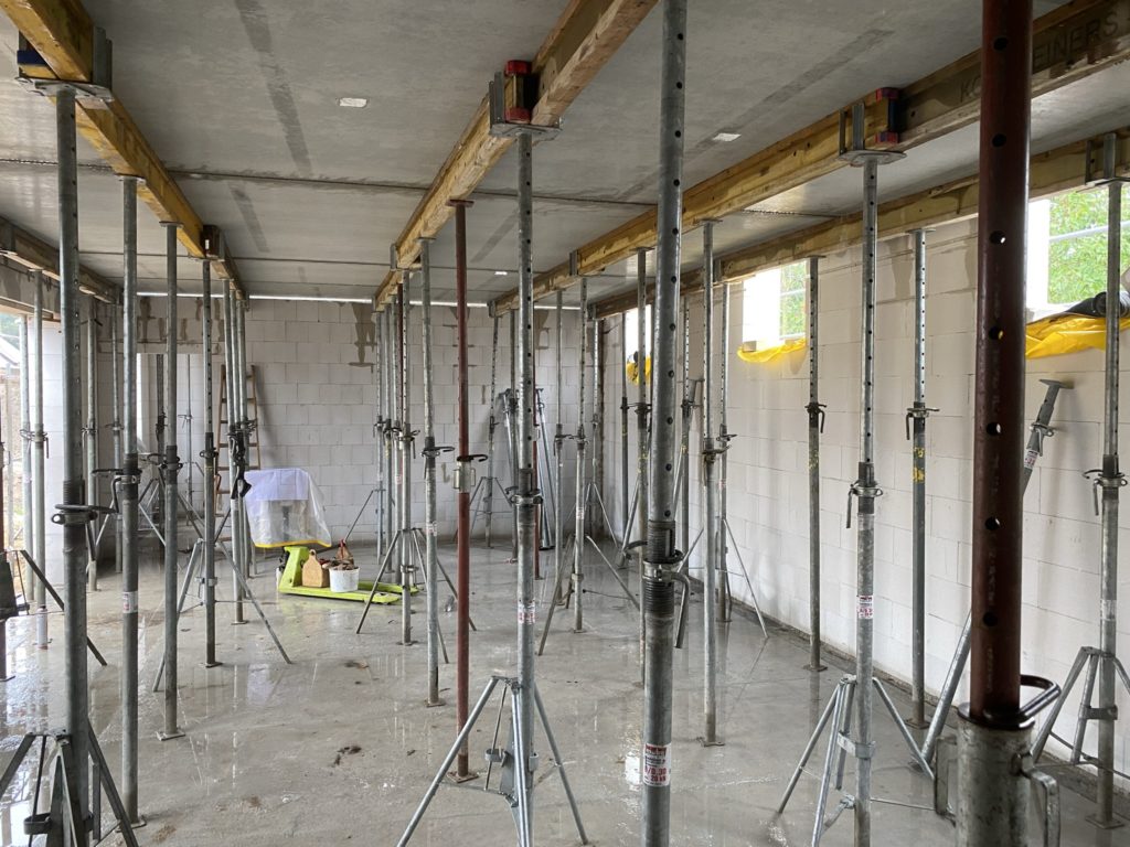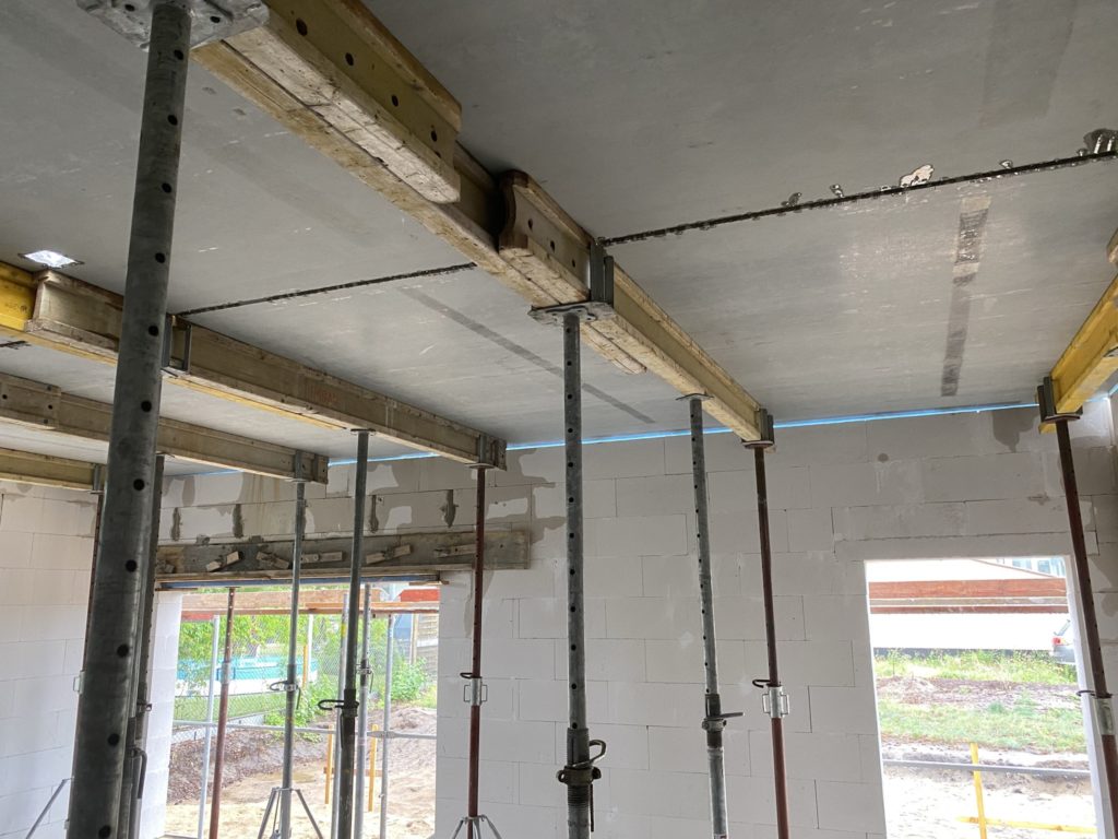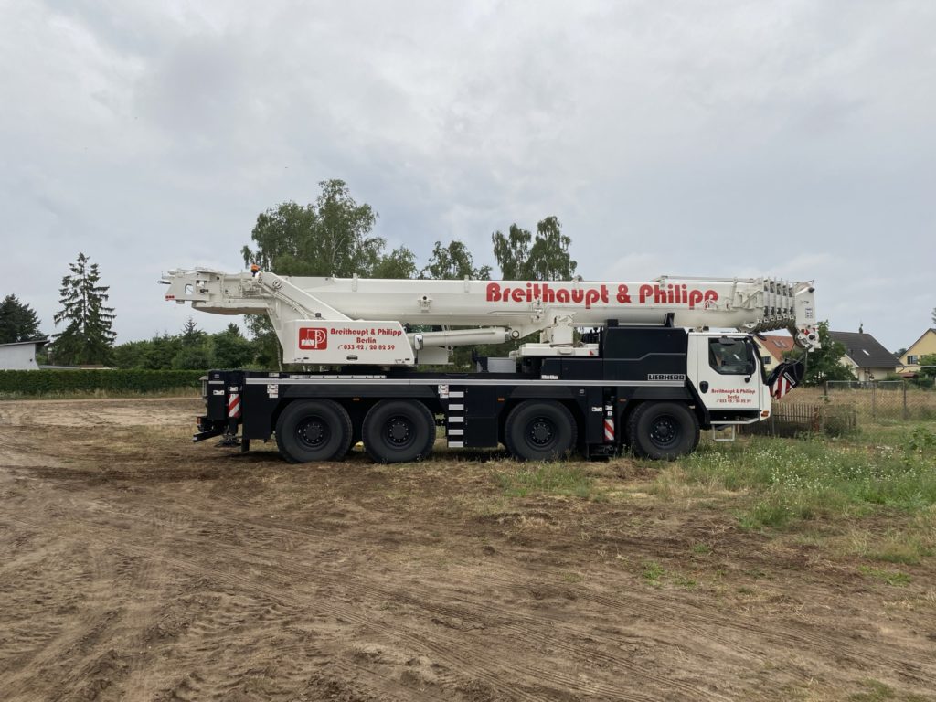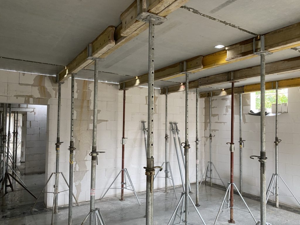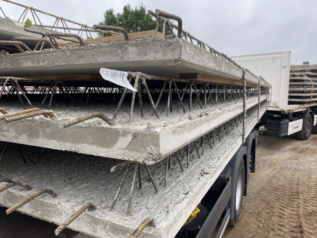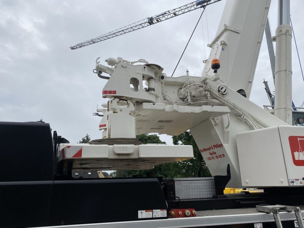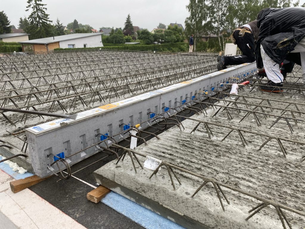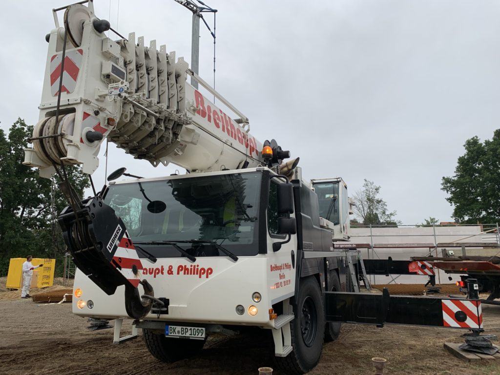 Heute wurden die Betonelemente fürs Dach gelegt. In nicht einmal 3 Stunden wurden alle 26 Elemente verlegt. Kurzeitig waren 3 Krane gleichzeitig im Einsatz. Der „kleine Arm“ am LKW der den Stahl abgeladen hat, der normale Baukran hat Platz geschaffen und der große 60-Tonnen-Autokran hat verlegt. Zwischenzeitlich musste der Baukran einwenig Platz machen. Beim hintersten Element für die Garage war selbst der große Autokran schon bei 90% seiner Möglichkeiten angelangt. Das Element wiegt ca. 3,5 Tonnen und war recht weit weg. Das leichteste Element ist über dem Eingangsbereich mit gerademal 397 kg.