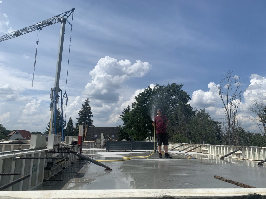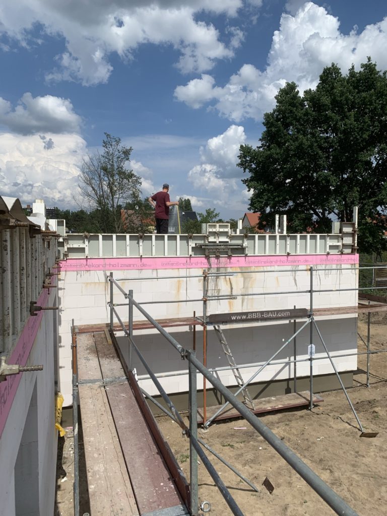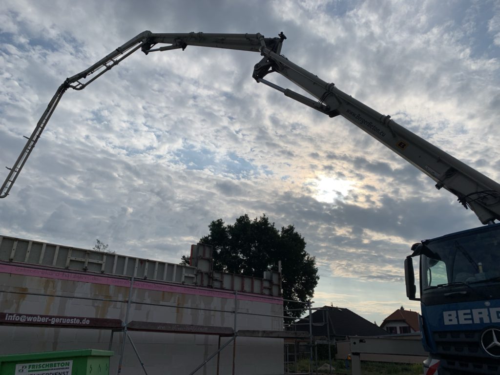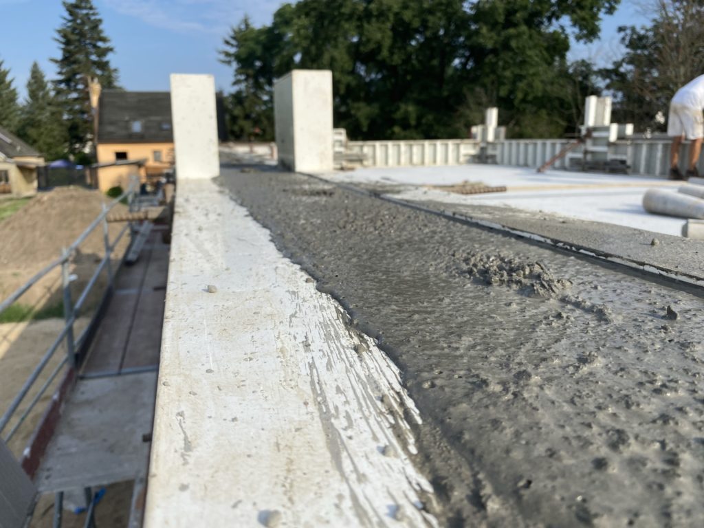 Tag 62 – Attika gegossen 27. Juli 2021 von ah Heute hat das Haus fast seine endgültige Höhe erreicht. Jetzt fehlen nur noch die 8cm Dämmung auf der Attika und das Abdeckprofil mit ca. 3-4mm. Das waren jetzt die letzen 10m³ Beton, also nochmal kanpp 25 Tonnen.