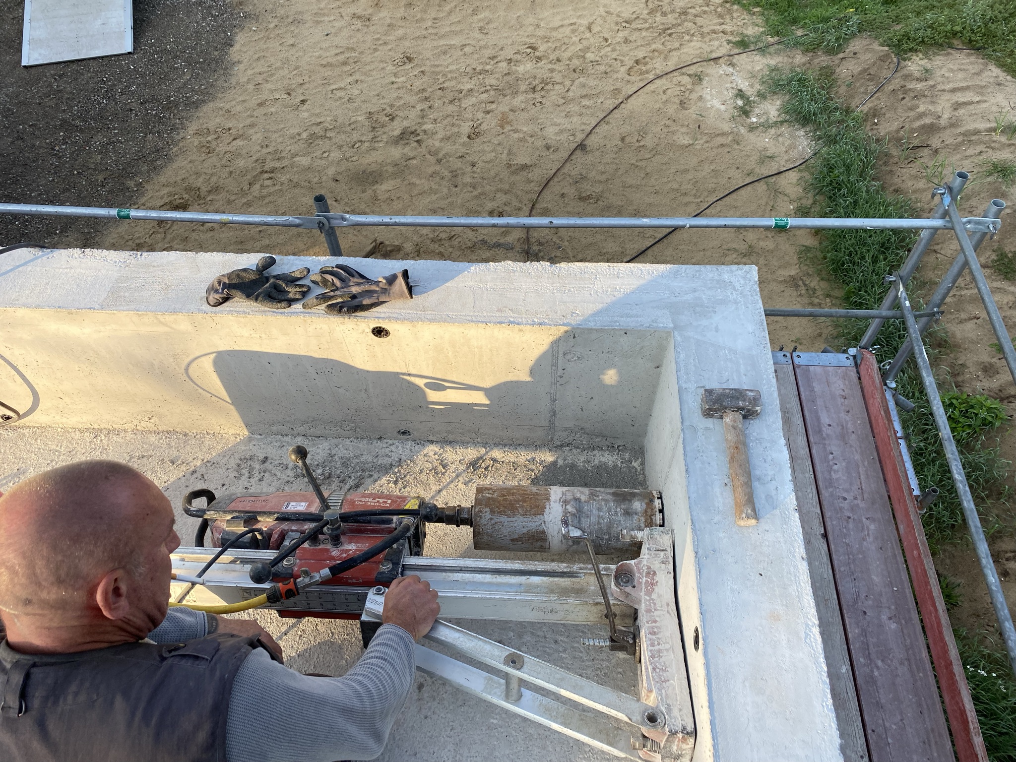 Heute wurden die Bohrungen für die Dachentwässerung gebohrt. 10x 150mm durch den Stahlbeton. Die erste von 3 Tiefenbohrungen für die Erdwärme war auch erfolgreich. Es wurde 62m tief gebohrt und dann die 4 Leitungen bei 60m Tiefe eingebaut und verpresst. Die Bodenschichten hier sind optimal für Erdwärme.