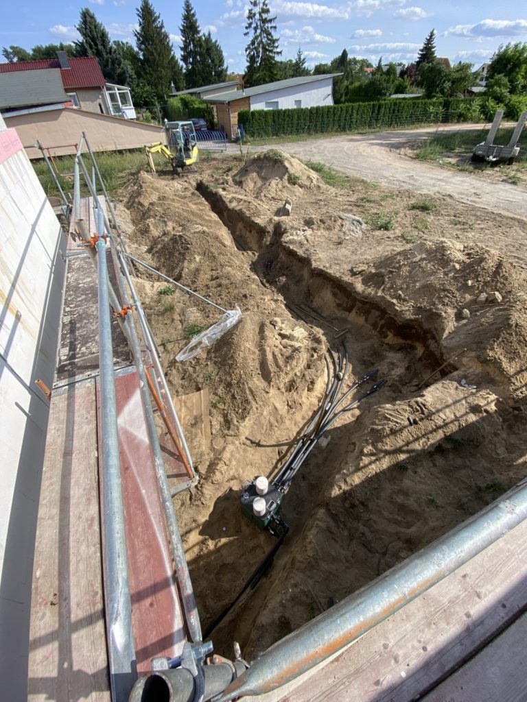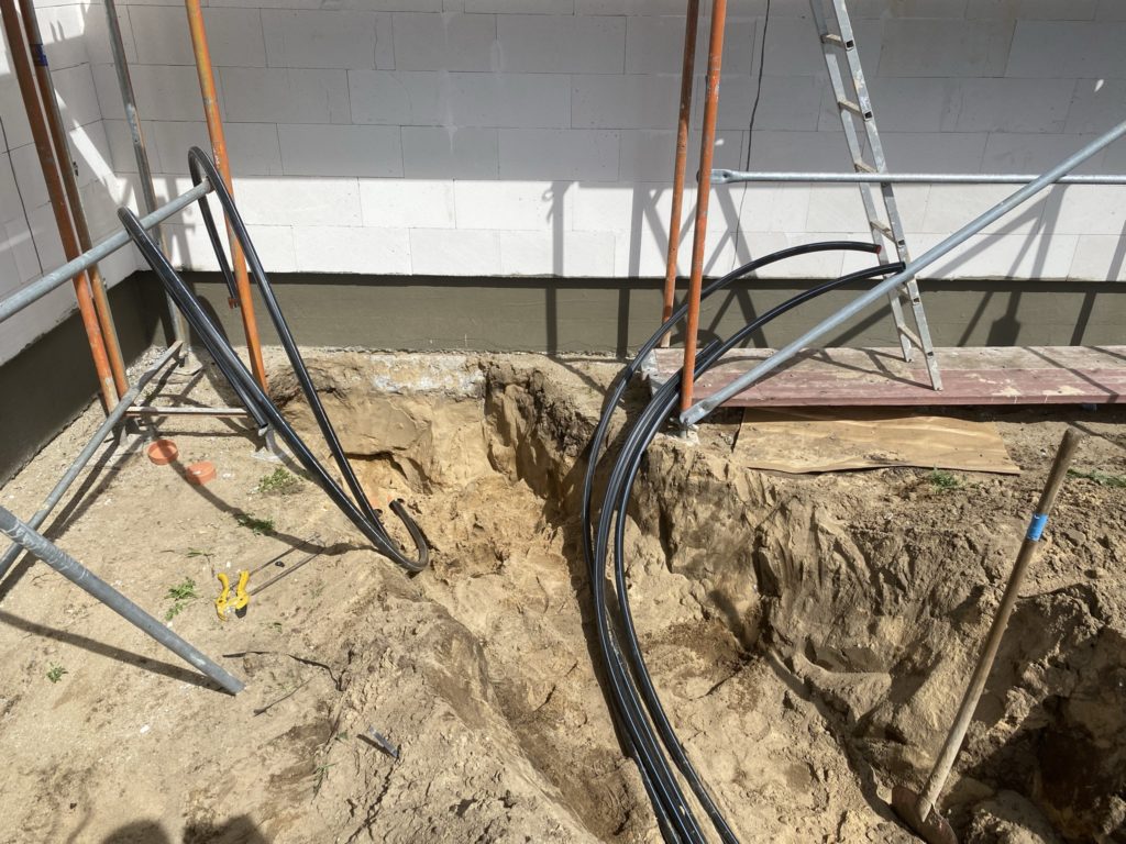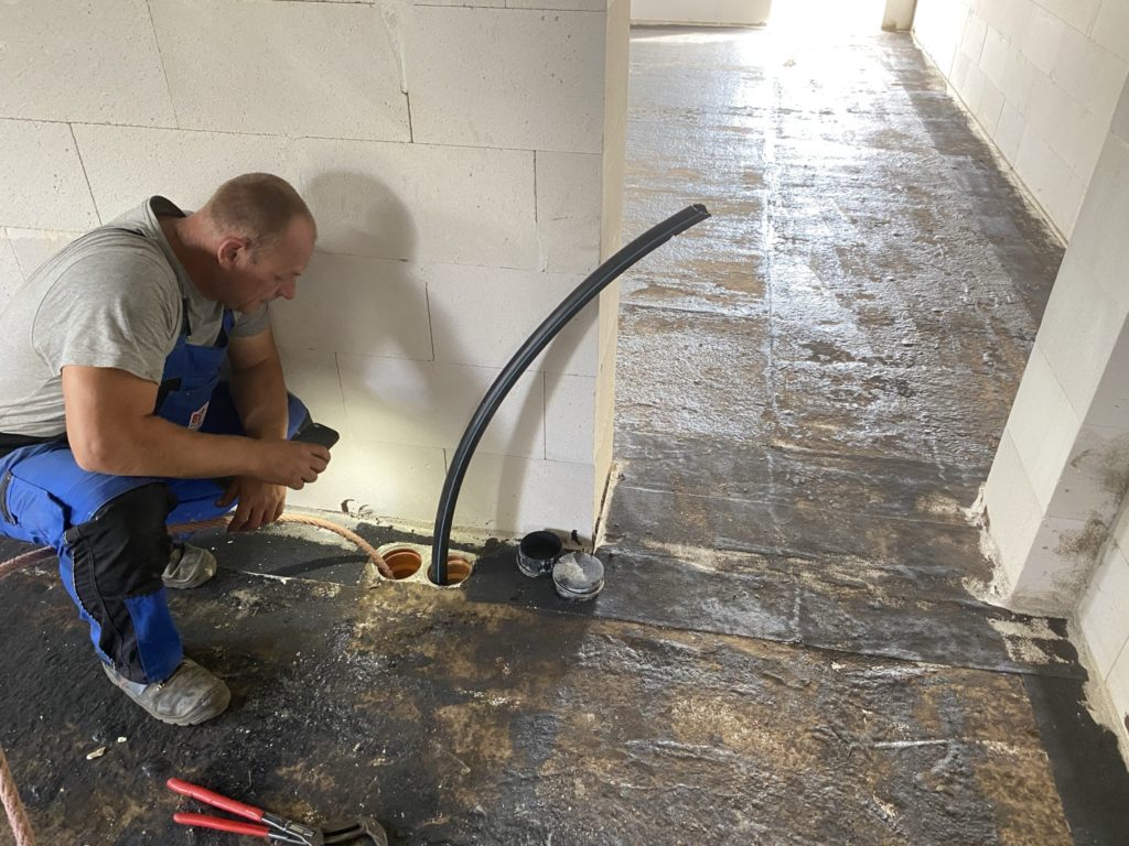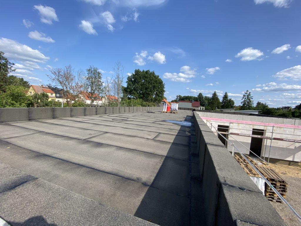 Heute wurde die Dampfsperre auf dem Dach abgeschlossen. Die Dachfläche und die Attika sind jetzt dicht. Die Leitungen für die Erdwärme sind komplett angeschlossen und abgedrückt. Auch alles dicht.