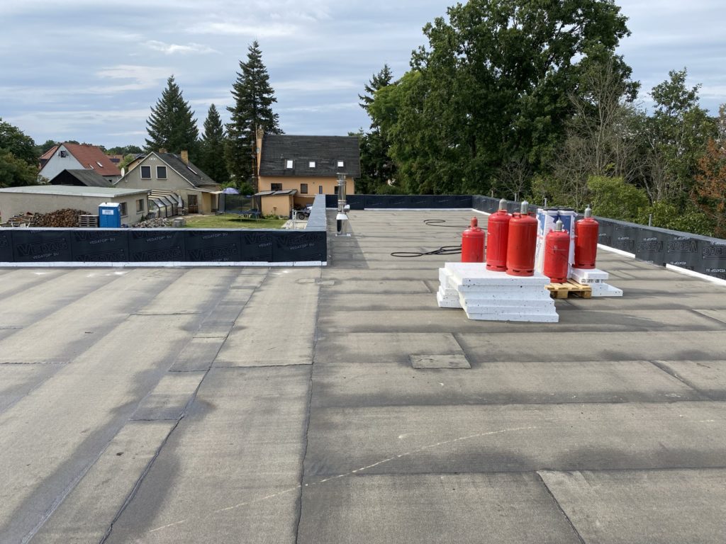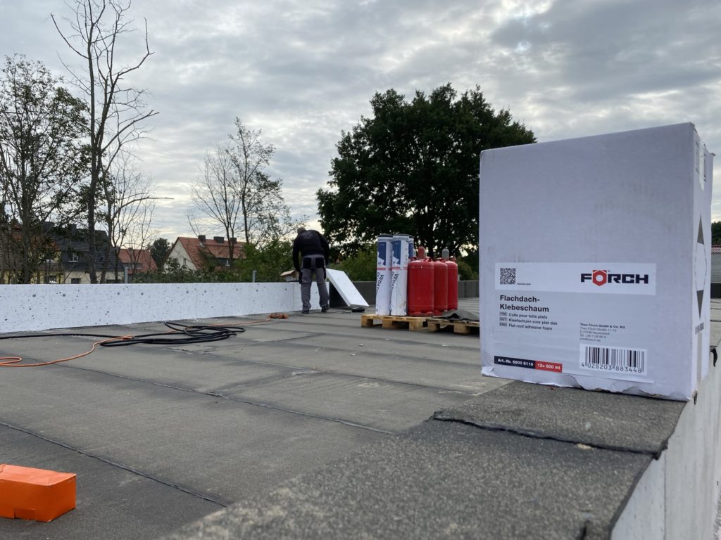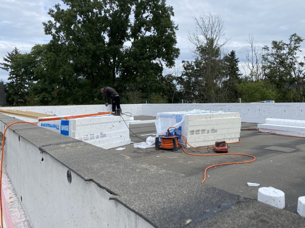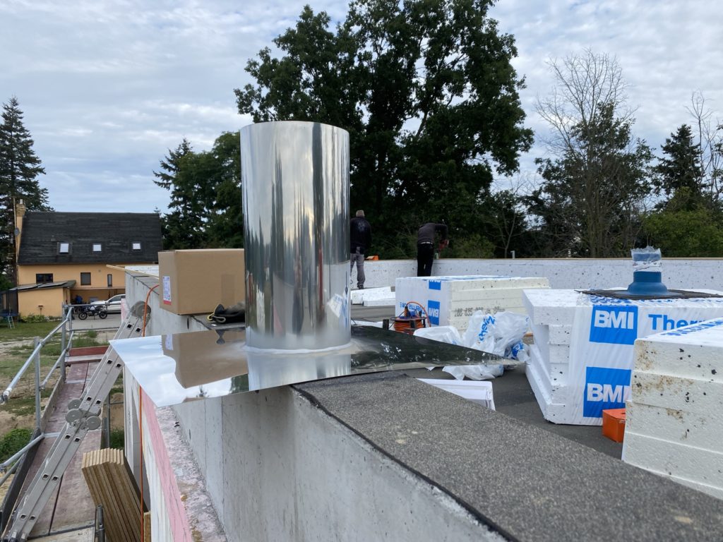 Heute wurde der Großteil der Attikadämmung von oben und innen angebracht und verschweißt. Außerdem wurde der obere Teil der Abgasanlage für den Kamin installiert. Früher sagte man Schornstein, heute ist das eine Abgasanlage.