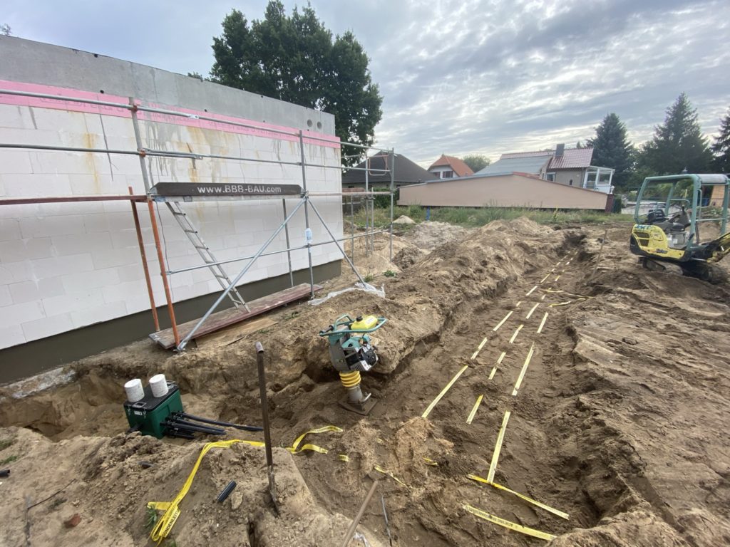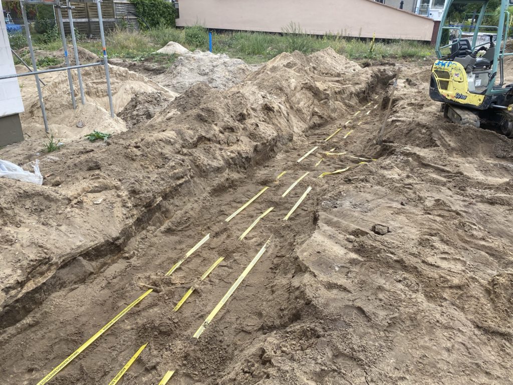 Die Leitungen für die Erdwärme sind jetzt auch verschwunden und die Fläche wieder halbwegs eben. Die Leitungen sind jetzt mit der Sole gefüllt.