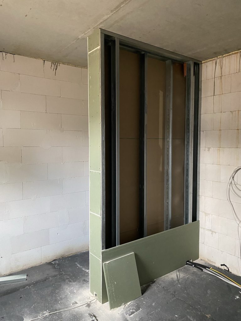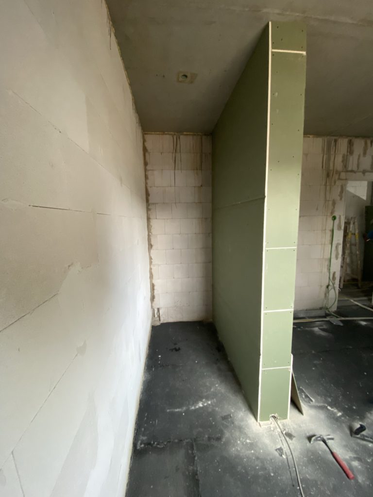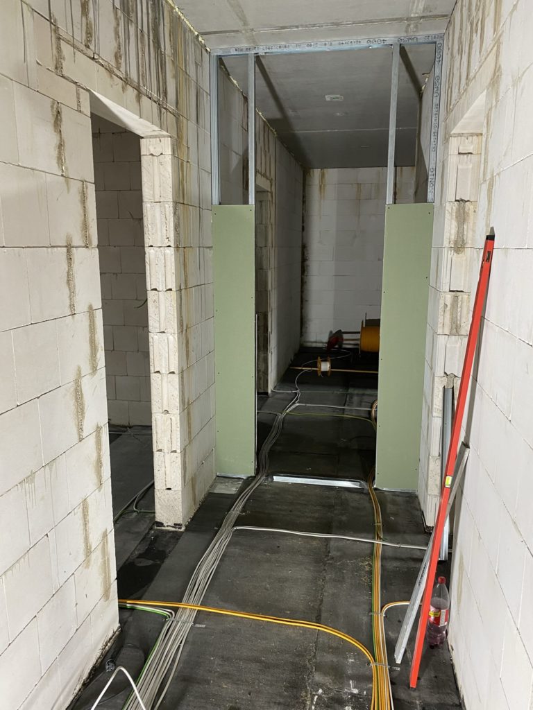 Der Trockenbau in den Bädern und der Flurtrennung beginnt. Sehr kurzfristig und am Samstag begann unser Partner für den Innenausbau mit dem Trockenbau, da ab Dienstag die Wasser- und Heizungsleitungen verlegt werden sollen. Dazu müssen die großen Trockenbauten zumindest in Bodennähe abgeschlossen sein. Das hat super geklappt und wir sind zuversichtlich, dass der weitere Innenausbau im geplanten Zeitraum fertiggestellt werden kann.