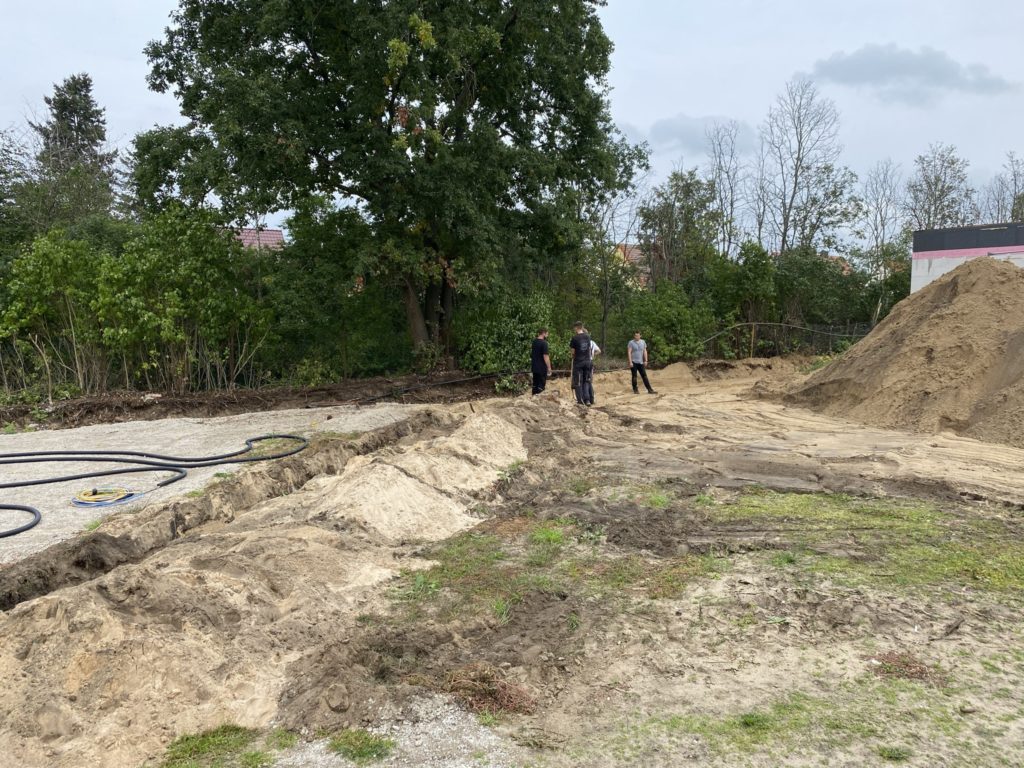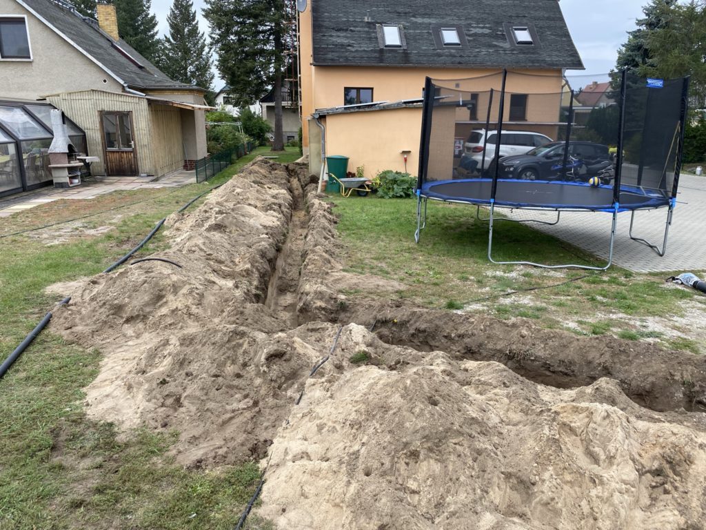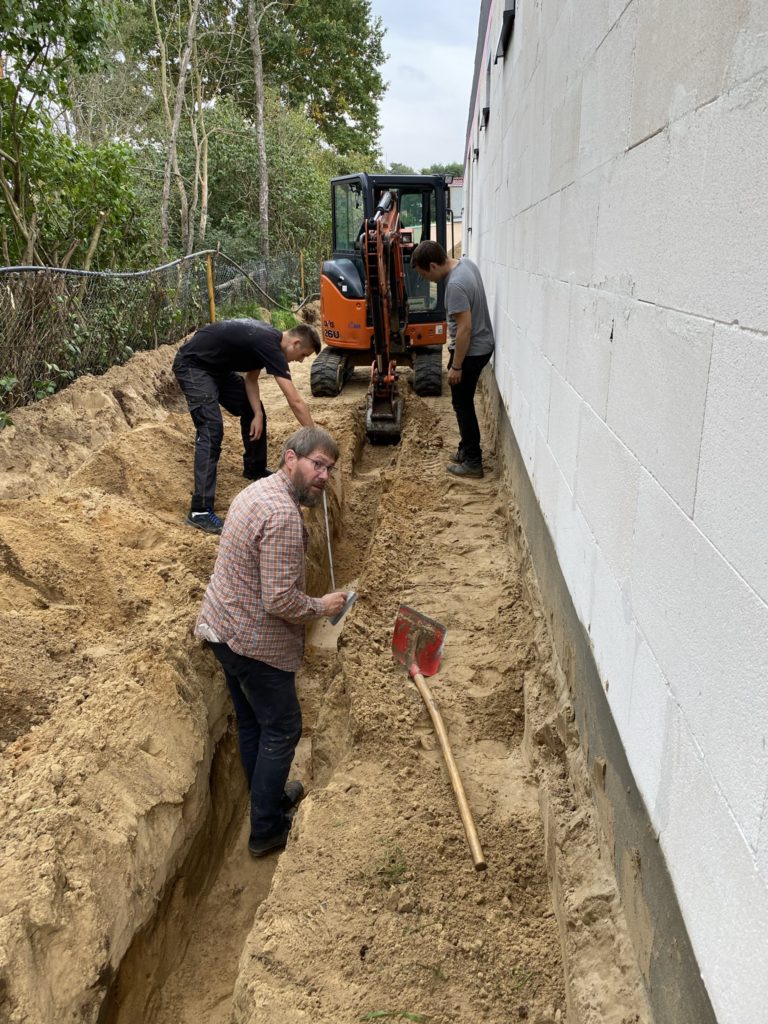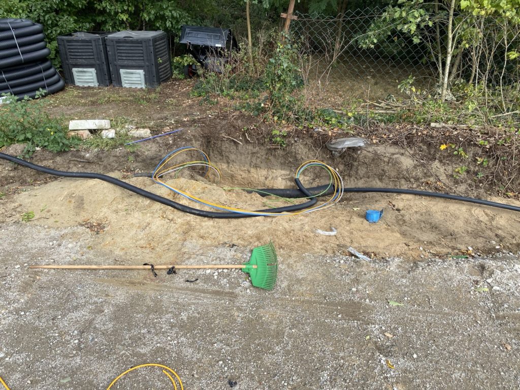 Heute wurden – natürlich mit archaologioscher Begleitung – die Gräben für Medienleitungen gebaggert und zum Teil bereits verlegt. Insgesamt wurden ca. 500m Netzwerkkabel, 250m Glasfaser, 250m KXN-Kabel und 125m Coax-Kabel in Leerrohre eingezogen. Außerdem wurde die Trinkwasserleitung in das vorhandene Leerrohr eingezogen.