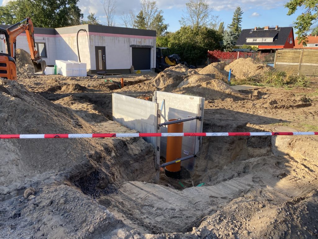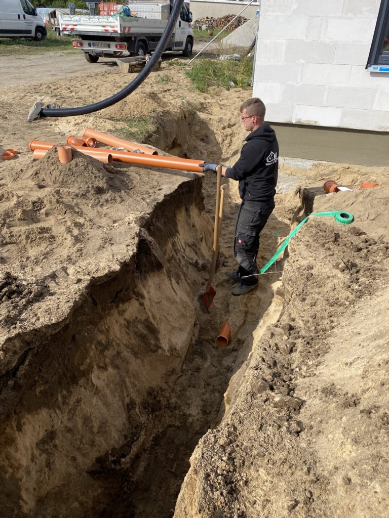 Nach einer Armada von Brawag Mitarbeitern heute früh, wurde dann der Abwasseranschluss korrigiert. Das Steinrohr hatte tatsächlich von außen das korrekte Gefälle, innen aber ein Kontergefälle. Das Rohr wurde dann gedreht, Fehler in der Hauptleitung behoben und dann der Übergabeschacht gebaut. Jetzt fehlen noch insgesamt ca. 6-8 Meter, dann ist der Anschluss an die Abwasserleitung auch fertig.