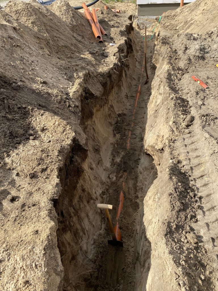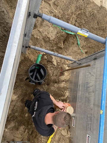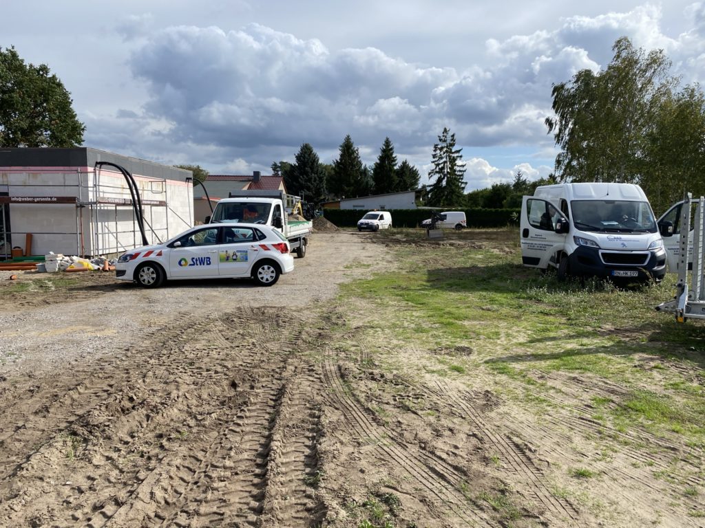 Heute früh wurde die Verbindung der Trinkwasserleitung geschweißt. Weil der nette Herr nicht die Kerbe vom Zugdraht gesehen hat, gab es dann erstmal eine Springbrunnen in der Einfahrt. Nach zwei weiteren Schweißmuffen war die Leitung dann verbunden und es spuckte und dann sprudelte zum ersten Mal Wasser im neuen Haus.