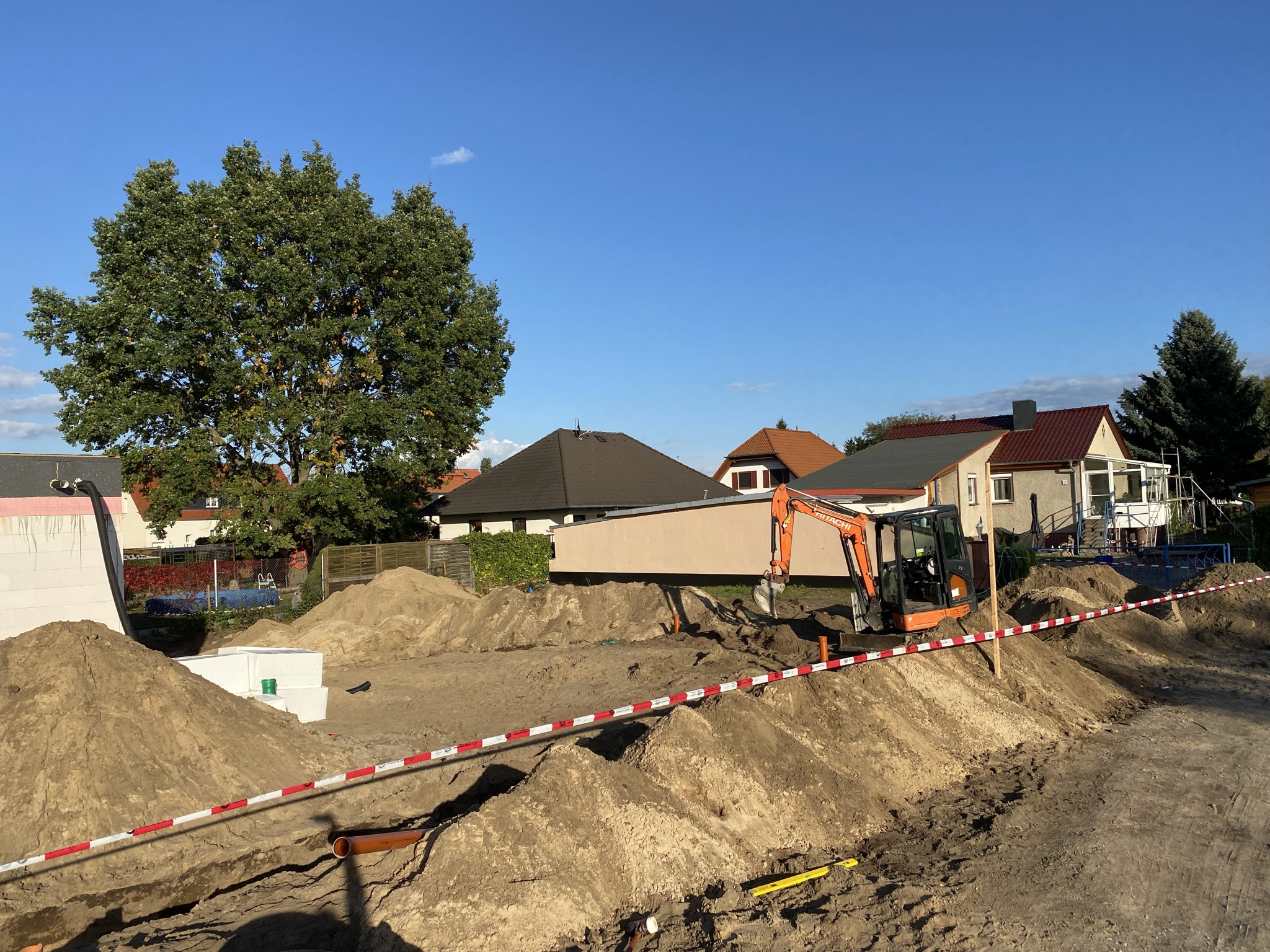 Nach einer Armada von Brawag Mitarbeitern heute früh, wurde dann der Abwasseranschluss korrigiert. Das Steinrohr hatte tatsächlich von außen das korrekte Gefälle, innen aber ein Kontergefälle. Das Rohr wurde dann gedreht, Fehler in der Hauptleitung behoben und dann der Übergabeschacht gebaut. Jetzt fehlen noch insgesamt ca. 6-8 Meter, dann ist der Anschluss an die Abwasserleitung auch fertig.