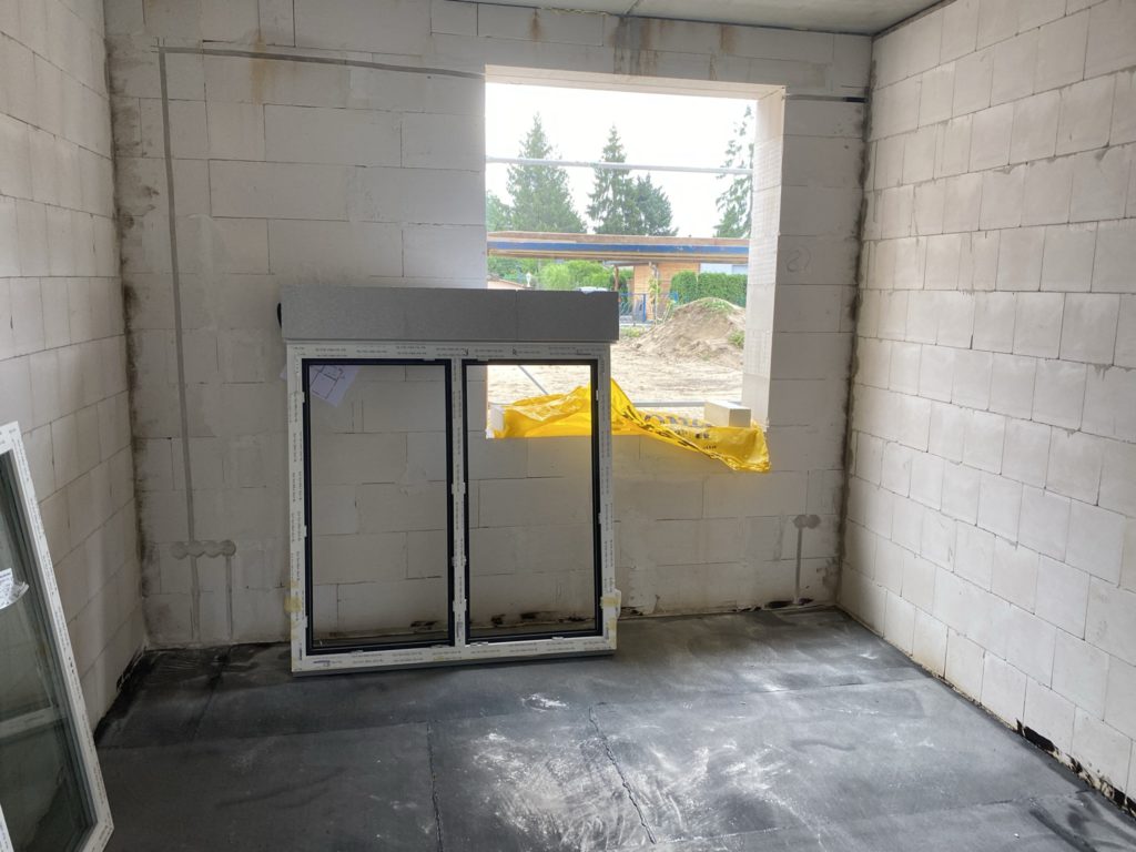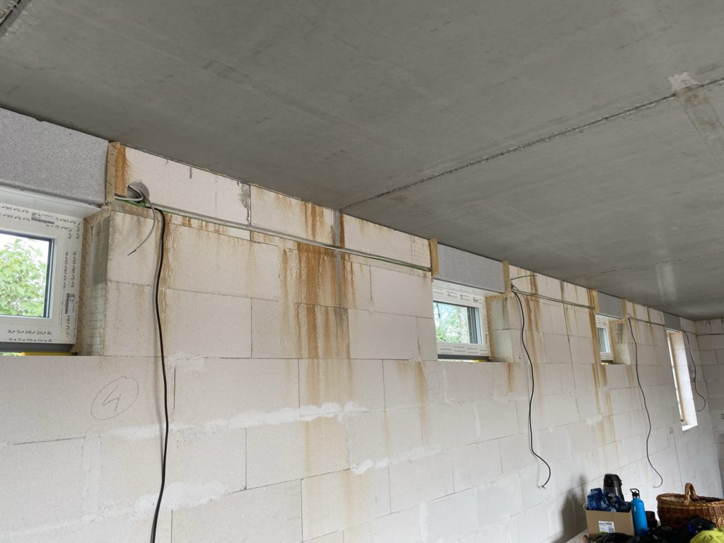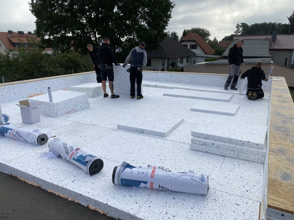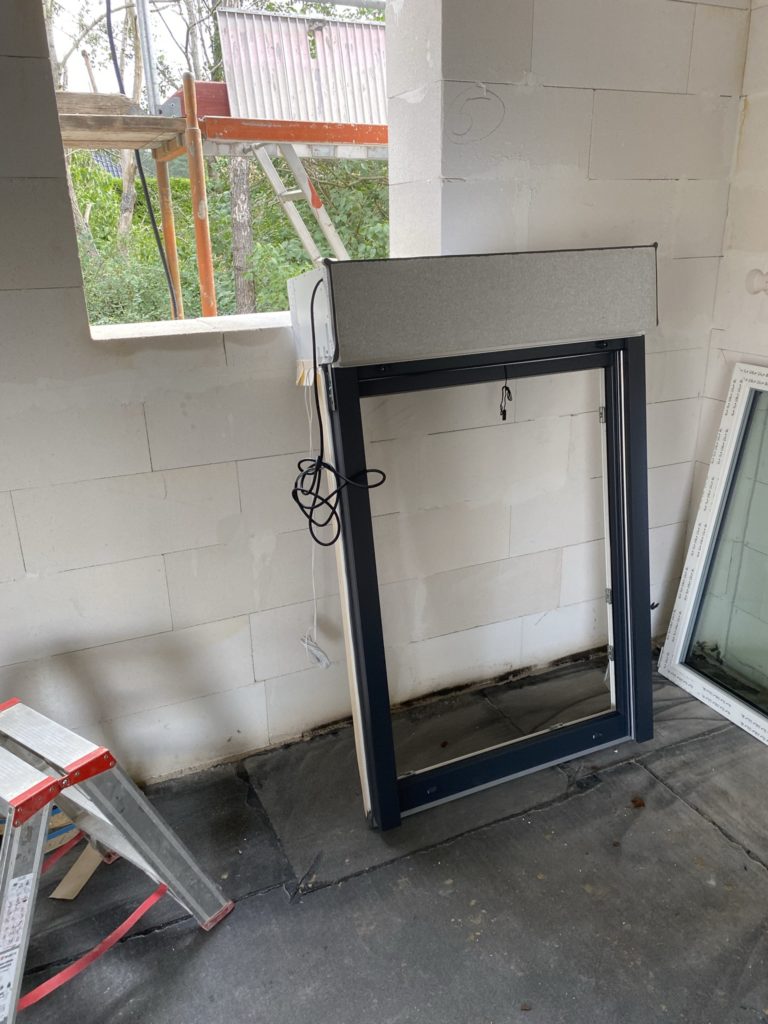 Heute wurden die Fenster, Terrassentüren und die Garagentür geliefert und fast alles eingebaut. Die Haustür hat leider 2 Wochen Verzögerung – hoffen wir das es bei 2 Wochen bleibt, dann ist der Zeitplan noch zu schaffen. Gleichzeitig wurde die Dämmung und die Gefälledämmung auf dem Garagendach eingebaut und abgedichtet. Mit den Terrassentüren hatten die Monteure ordentlich zu kämpfen, da diese sehr schwer sind. Auf dem einen Foto sieht man auch warum. Es sind faktisch 4 Scheiben, die äußeren beiden mit einer Sicherheitsfolie verbunden als A3 Sicherheitsverglasung VSG 9mm und die Beschläge mit Sicherheitsklasse RC2. Es ist vermutlich leichter durch die Wand zu kommen als durch diese Fenster und Türen.