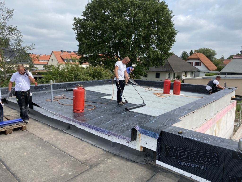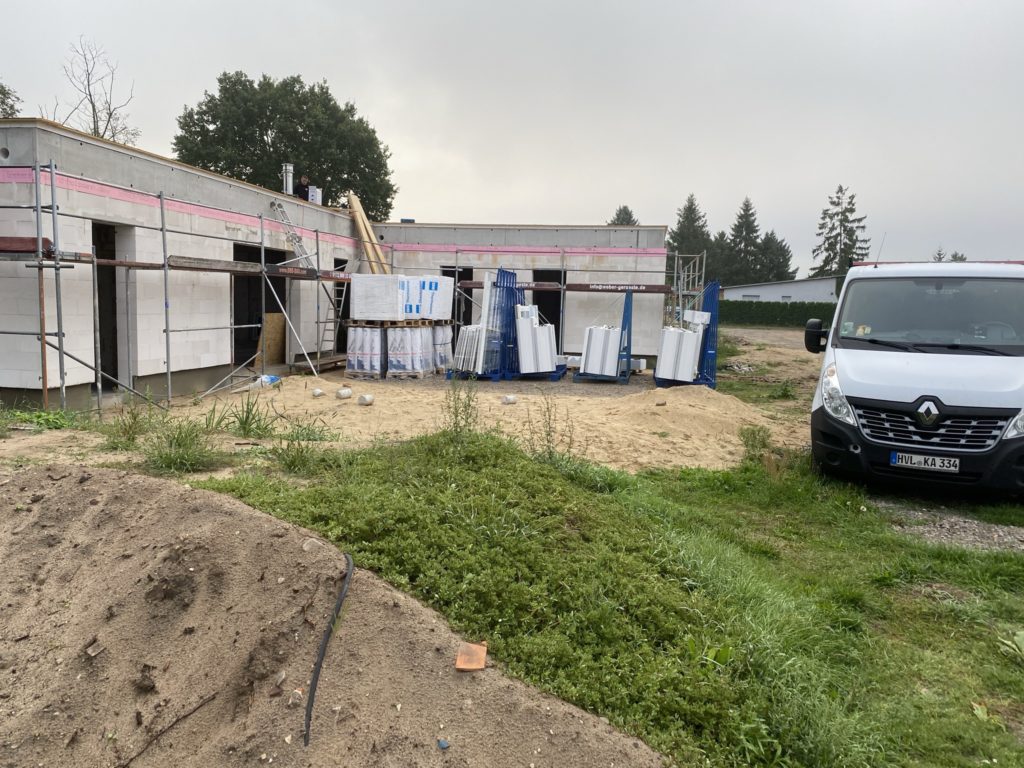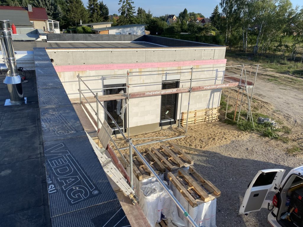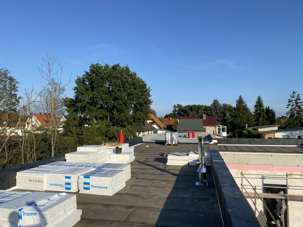 Heute wurden die Fenster, Terrassentüren und die Garagentür geliefert und fast alles eingebaut. Die Haustür hat leider 2 Wochen Verzögerung – hoffen wir das es bei 2 Wochen bleibt, dann ist der Zeitplan noch zu schaffen. Gleichzeitig wurde die Dämmung und die Gefälledämmung auf dem Garagendach eingebaut und abgedichtet. Mit den Terrassentüren hatten die Monteure ordentlich zu kämpfen, da diese sehr schwer sind. Auf dem einen Foto sieht man auch warum. Es sind faktisch 4 Scheiben, die äußeren beiden mit einer Sicherheitsfolie verbunden als A3 Sicherheitsverglasung VSG 9mm und die Beschläge mit Sicherheitsklasse RC2. Es ist vermutlich leichter durch die Wand zu kommen als durch diese Fenster und Türen.