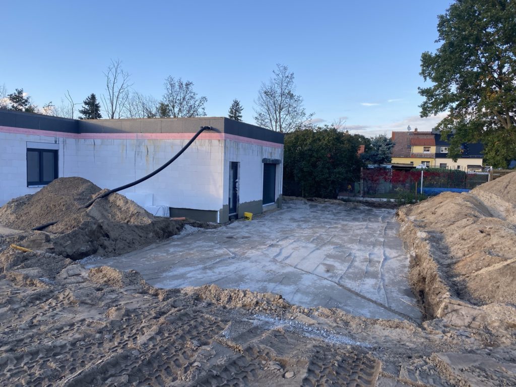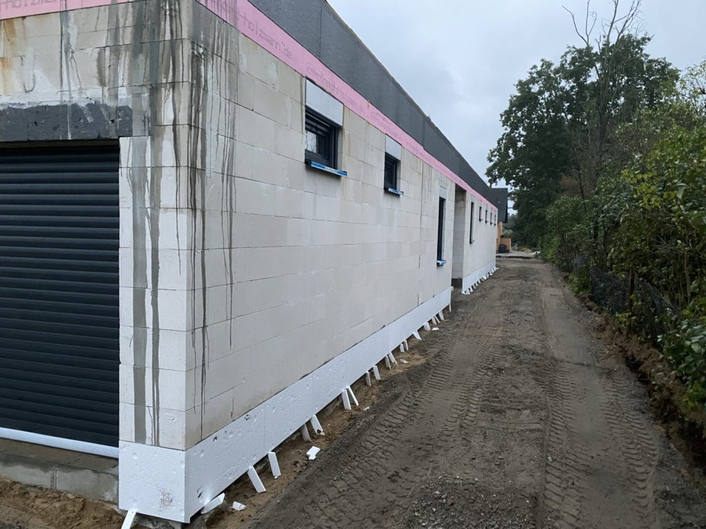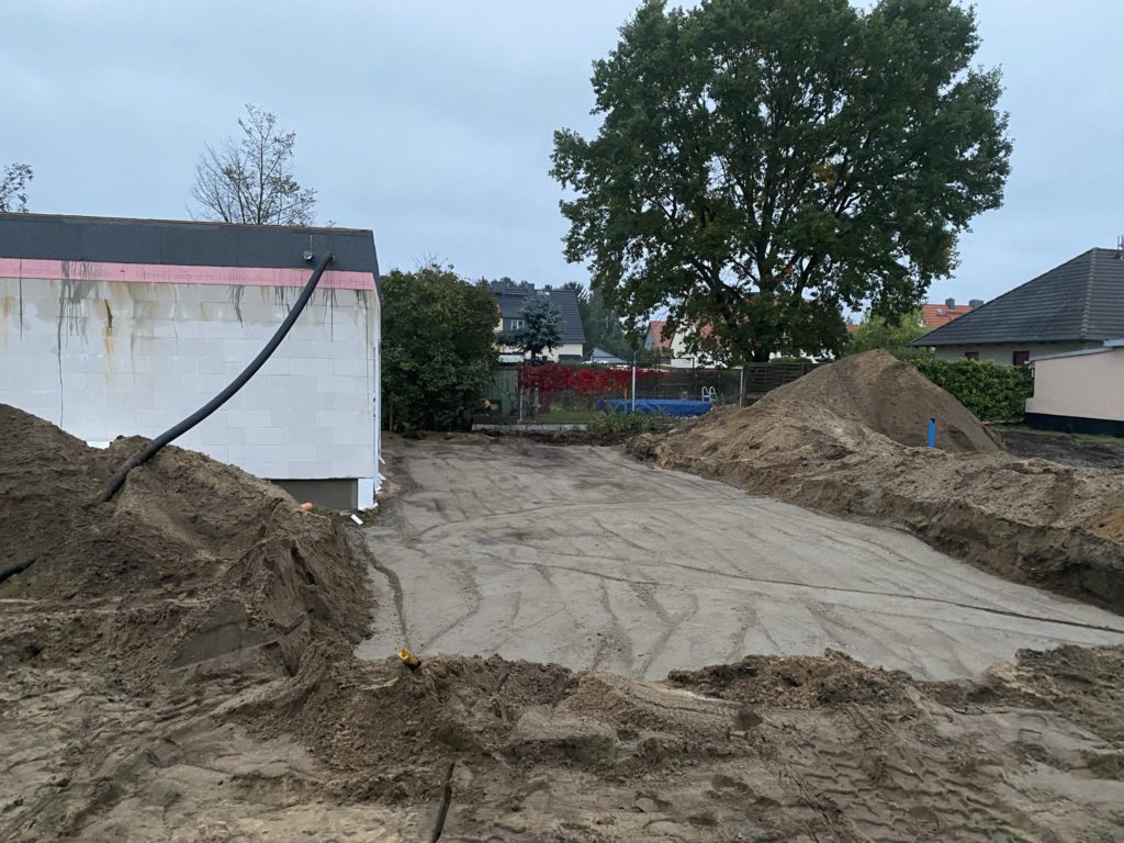 Gestern wurde die Fläche vor der Garage und für den Carport ausgehoben und mit einer ersten Schicht Recycling verdichtet. Gleichzeitig wurde gestern und heute die Sockelabdichtung im Bereich der Zufahrt und Garage angebracht. Außerdem wurde heute die Feuerschutztür zwischen Garage und Technikraum eingebaut. Damit kann dann ab morgen der Innenputz im Technikraum beginnen, damit hoffentlich ab Montag die Heizung montiert werden kann.