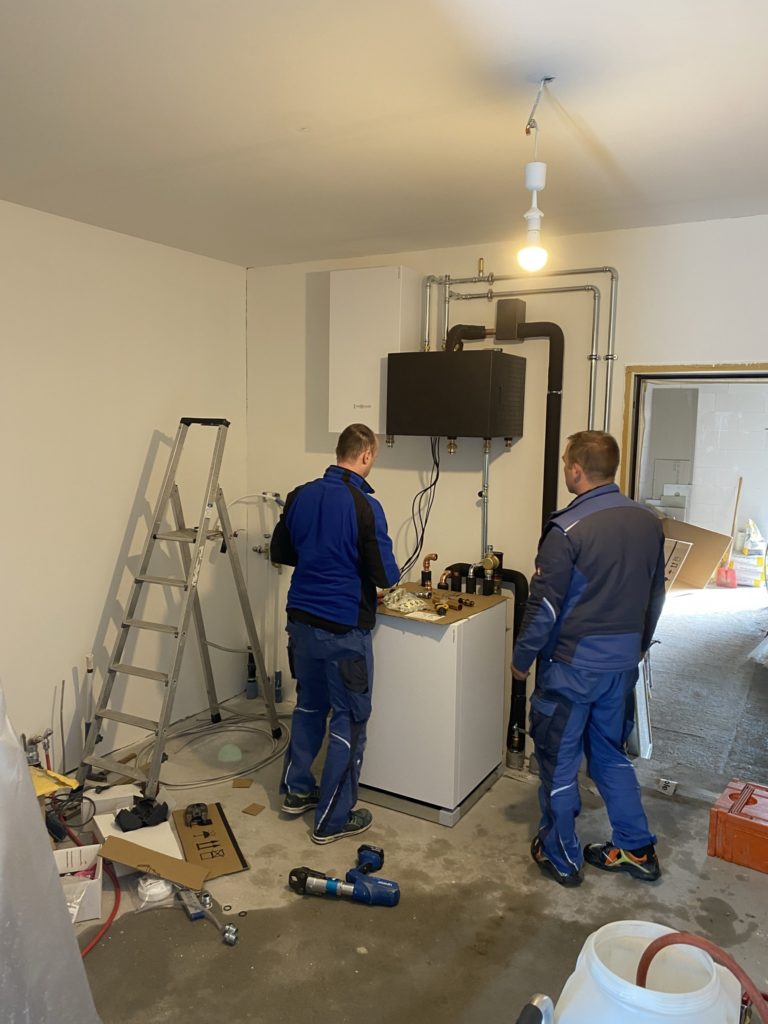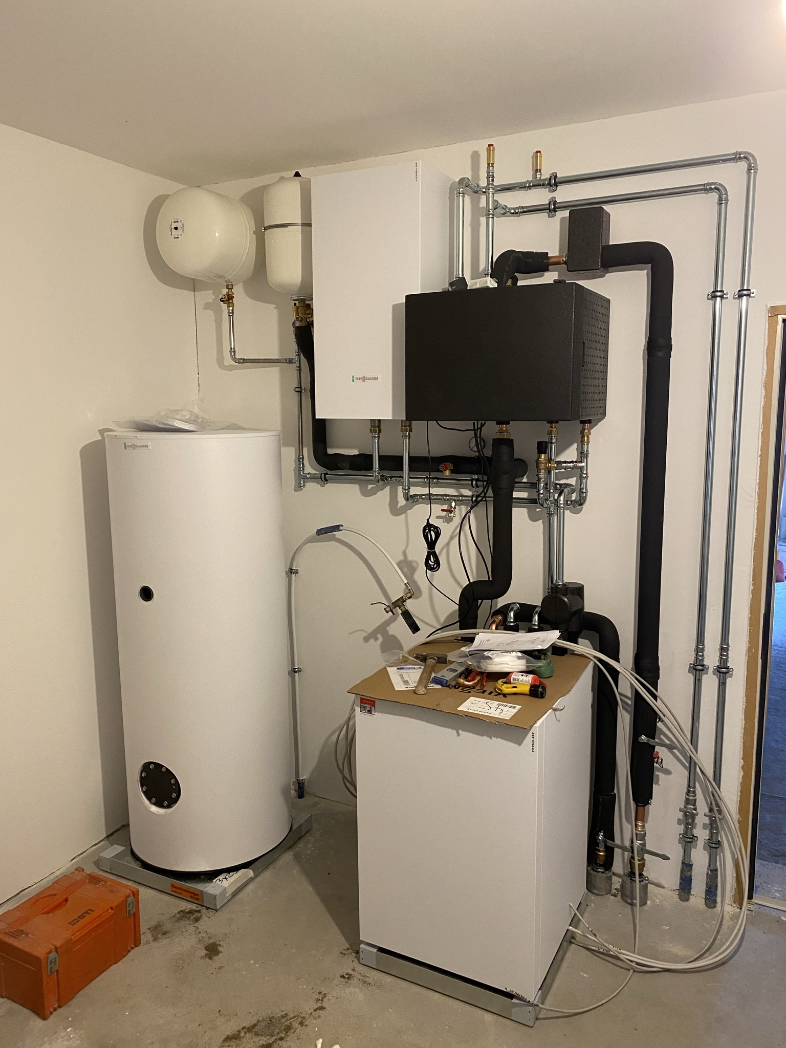 Heute wurde ein großer Teil der Heiungsanlange installiert. Die Wärmepumpe, Pufferspeicher, NC-Box und 2 Ausgleichsbehälter sind bereits montiert. Der Wasserspeicher steht und wird dann morgen angeschlossen. Die Heizkreise wurde bereits mit entkalktem und entsalztem Wasser gefüllt und gespült.
