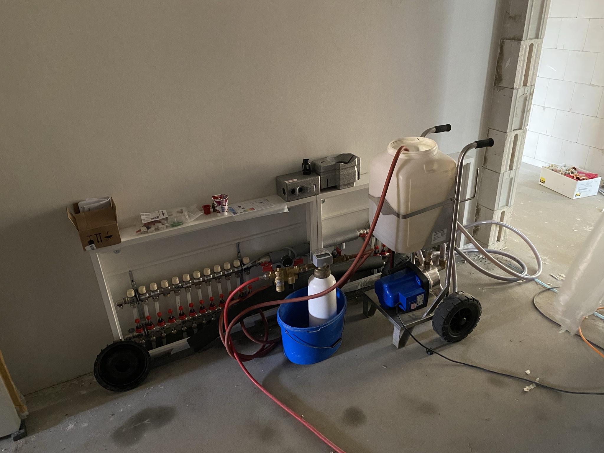 Der Maler/Putzer hat heute früh noch schnell den Technikraum gestrichen, damit er weniger Aufwand hat, wenn die Heizung installiert ist. Dafür war er schon kurz nach 5 Uhr da.