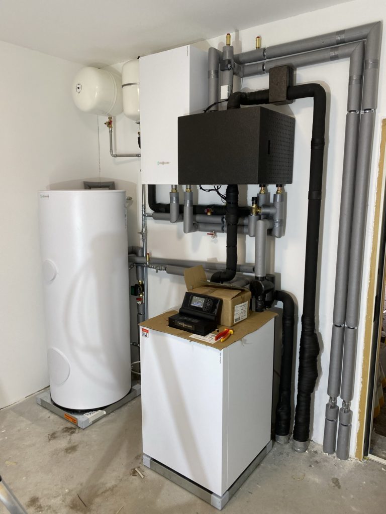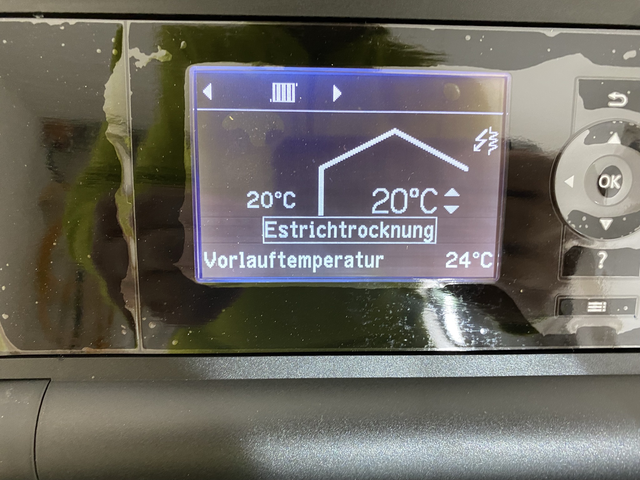 Heute wurde die Heizung fertiggestellt und das Aufheizprogramm für den Estrich gestartet. Dabei wird jetzt jeden Tag die Temparatur um 5 Grad erhöht, dann einige Tage gehalten und dann wieder langsam abgesenkt. Das wird schön kuschelig in den nächsten Tagen. Heute war der Fußboden auf 25 Grad eingestellt.