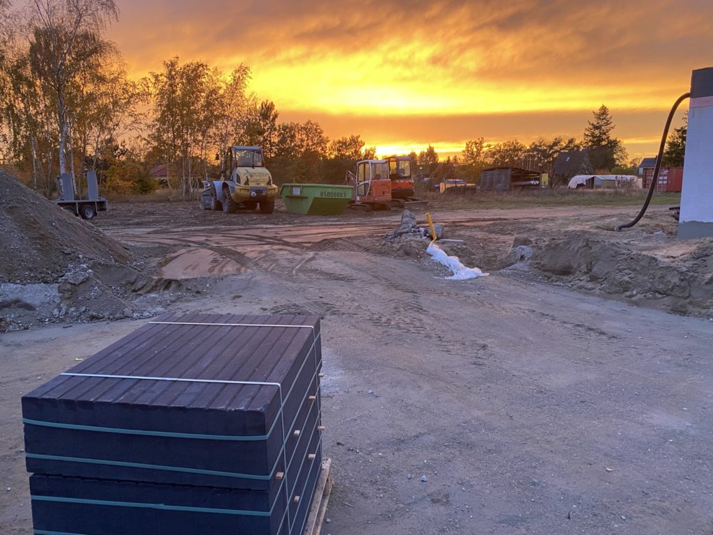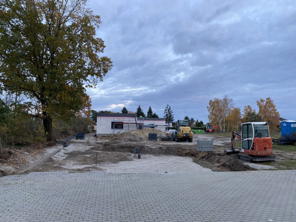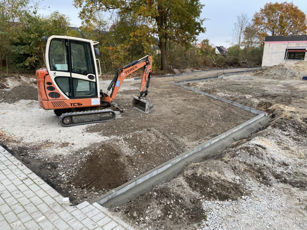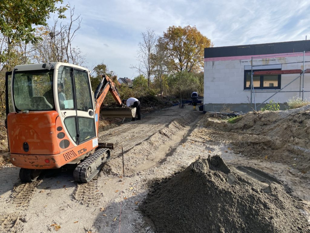 Am Tag 160 begannen dann auch die Außenarbeiten für die Zufahrt und PKW-Stellflächen. Mit den sehr unterschiedlichen Höhenlagen ist es gar nicht so einfach ein sinnvolles Entwässerungskonzept zu finden. Letztendlich wurde aber eine gute Lösung gefunden, die jetzt umgesetzt wird. Insbesondere die Feuerwehrbewegungsfläche war auf Grund der vorgeschriebenen Größe und der Lage im Gelände recht aufwendig.