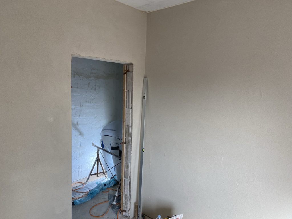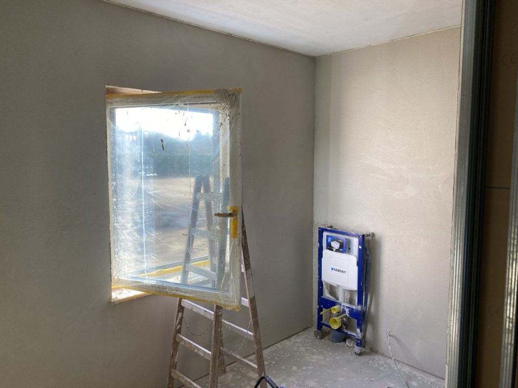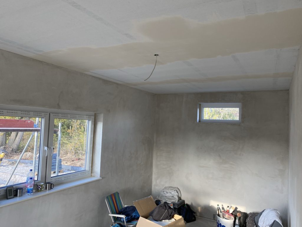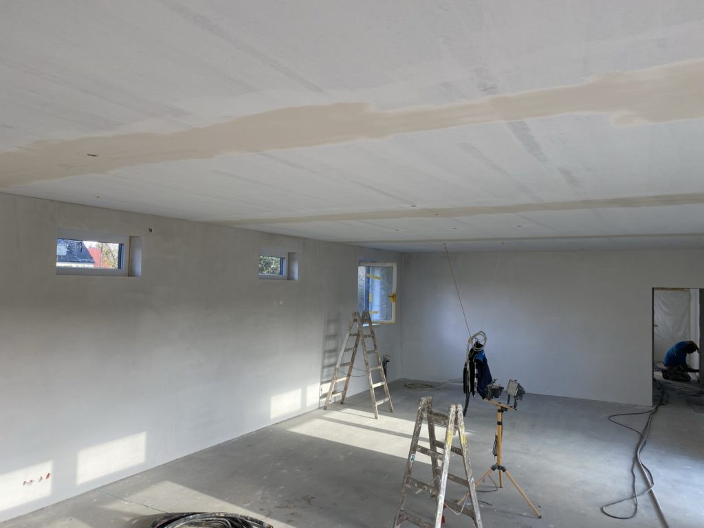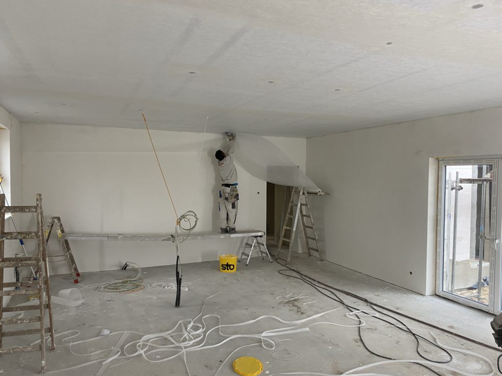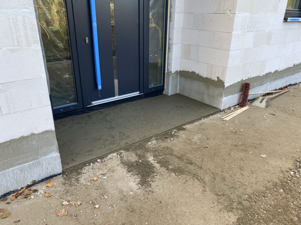 Gleichzeitig gehen im Haus die Putzarbeiten weiter. Aktuell ist das Wohnzimmer, Arbeitszimmer und Schlafzimmer mit dem Oberputz fertig. Im Wohnzimmer und Arbeitszimmer ist die Decke bereits gespachtelt und im Wohnzimmer schon das Glasflies an der Decke. Aktuell sind jeden Tag 6-7 Leute im Haus mit Putzen beschäftigt und 3 kümmern sich um die Zufahrt. Der Eingangsbereich wurde jetzt auch mit Straßenbeton aufgefüllt. Dort wird dann wasserdicht bis zur Tür gepflastert.